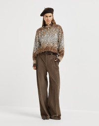 Precious embroideries and refined materials enrich this new dazzling degrade embroidery sweater in mohair and wool. A shimmering cascade of different colored sequins illuminates the garment’s surface with its reflections, creating a nuanced design. The embroidery is applied to a mohair and wool net-like knit base that gives the style a soft, full appearance. The ribbed edges and the classic crew-neck complete the style of the sweater. MATERIALS The style showcases a refined degrade embroidery made of two colors of sequins: one tonal to the base and the other a contrasting color. The two together create a sophisticated, shiny shading. The embroidery is made on a knitted net-like base of brushed mohair and wool, and is performed vertically to preserve the garment’s structure and elasticity. DETAILS Crew-neck Drop shoulder Wide sleeve Special workmanship 81% MOHAIR, 11% NYLON, 8% WOOL