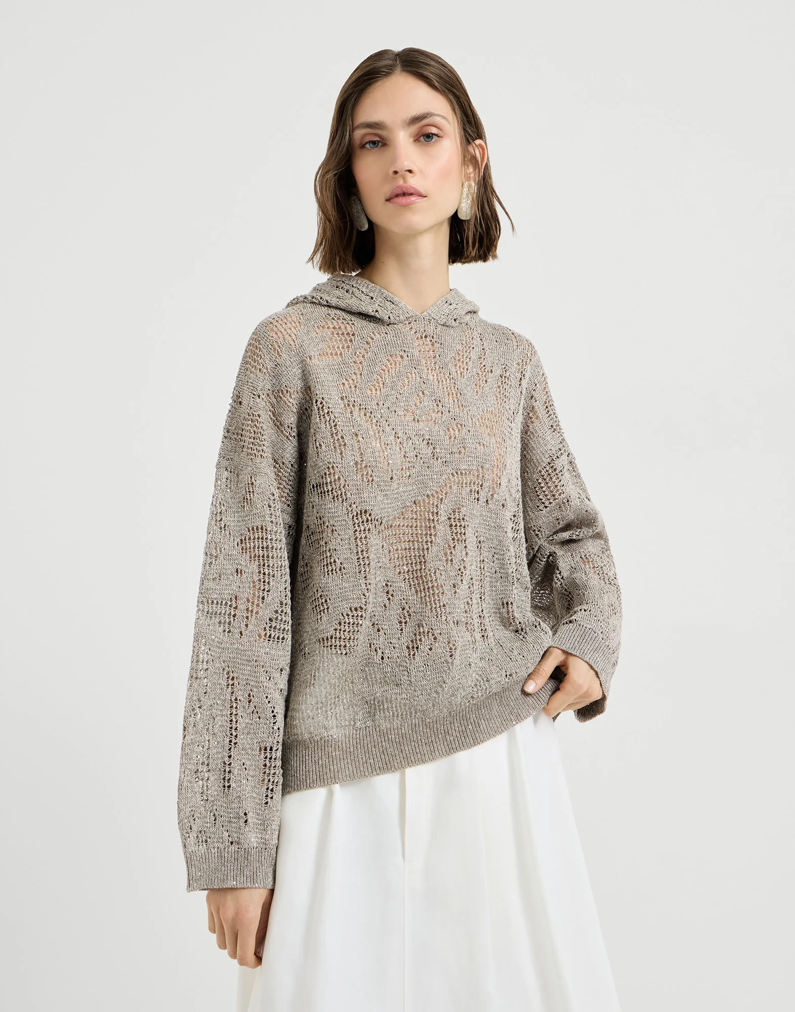 Motifs inspired by the beauty of nature and sophisticated knitting come together in this dazzling water lilies sweater. The clean silhouette is enriched with net-like knitting, which showcases a delicate floral "lace effect" design, illuminated by a shower of shimmering sequins. The ribbed edges gather the garment’s soft, relaxed volume, while the hood adds a functional note with a sporty feel. MATERIALS The linen and cotton yarn is particularly cool and lightweight, an ideal quality for wearing in the summer. A small percentage of cotton is combined with the linen’s sightly crisp, irregular texture to guarantee added comfort. DETAILS Hood Drop shoulder Rib knit cuffs and bottom band Special workmanship 94% LINEN, 6% COTTON