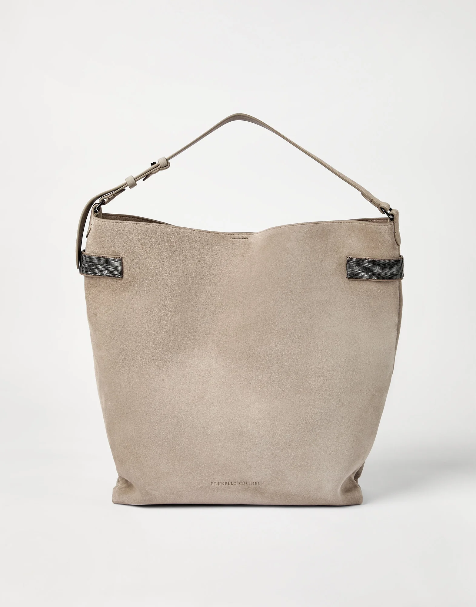 Soft volume and refined materials come together in perfect harmony in this new essence hobo bag. The velvety texture of suede enlivens the season’s color and complements the silhouette, characterized by relaxed folds that give the design a curvy look. Two precious monili embroidered inserts illuminate the bag's essential shape, hugging the sides with a delicate shimmering effect. The adjustable shoulder strap completes the style of the accessory with a functional detail. MATERIALS The refined suede is a compact leather with a soft, velvety texture. A leather lining completes the look of the bag. DETAILS Magnetic snap closure Adjustable and detachable shoulder strap Leather lining Internal pocket with zip closure Detachable internal pochette with zipper Nickel-free monili decoration The bag is 33 cm (13") long, 5.5 cm (2.17") wide, and 26 cm (10.24") high REAL LEATHER