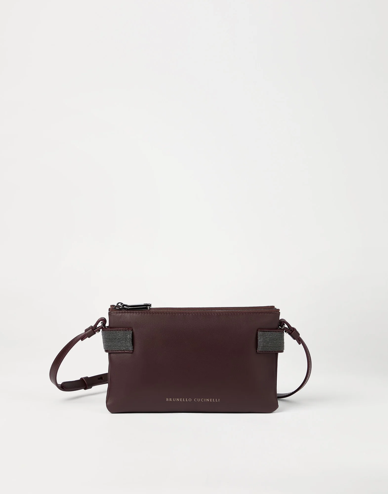 Iconic details and new concepts come together in this calfskin Essence mini shoulder bag. With a minimal, geometric appearance, the design features two elegant clutches joined on the sides by precious monili inserts that hug the accessory, adding a distinctive sparkle. The shoulder strap can be removed, allowing the bag to be carried in hand, to create countless styling options. MATERIALS The refined calfskin showcases a smooth, soft and even texture. The leather’s matte appearance brings out the season’s colors with an intense, rich effect. DETAILS Zip closure Adjustable and detachable shoulder strap Suede lining 1 slot for cards and business cards Nickel-free monili decoration Bag is 21 cm long, 5,5 cm wide and 13,5 cm high REAL LEATHER