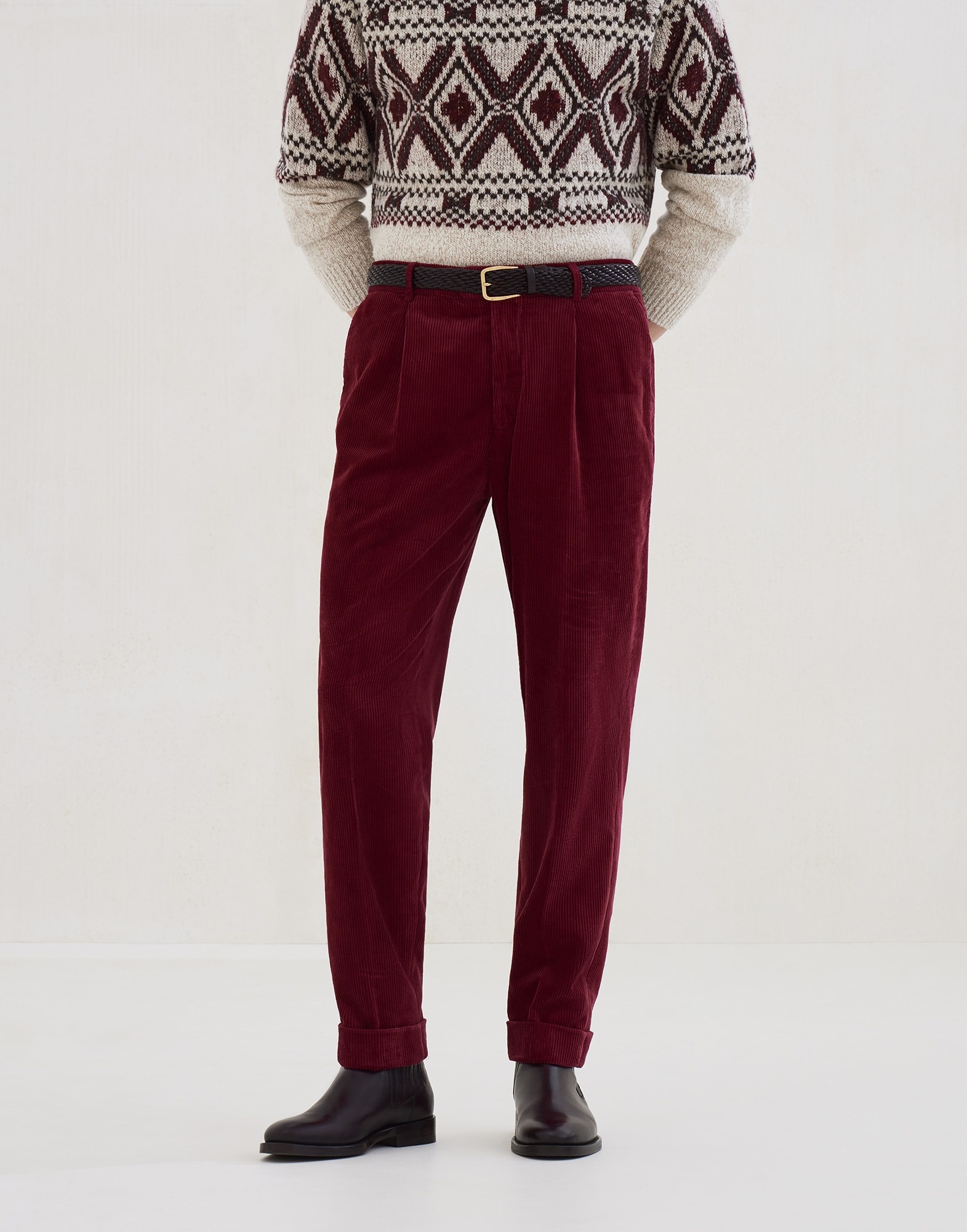 The excellence of Brunello Cucinelli workmanship enriches the essential style of these leisure fit pleated trousers. The design’s casual feel is conveyed by the corduroy fabric, garment-dyed for a distinctive color effect. The modern leisure fit is relaxed in the seat and showcases a sight low-rise, while remaining close to the body down the leg. MATERIALS Finished garment dyeing gives the corduroy’s sporty feel a slight “vintage” effect, characterized by the mild nuances visible particularly along the edges and seams of the garment. DETAILS Zip closure with button, metal hook and backing button Slanted front pockets Pleat Back welt pockets Cuffed hem Lining to knee 100% COTTON