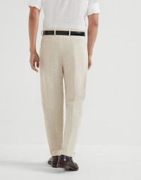 The excellence of Brunello Cucinelli workmanship enriches the essential style of these leisure fit pleated trousers. The design’s casual feel is conveyed by the corduroy fabric, garment-dyed for a distinctive color effect. The modern leisure fit is relaxed in the seat and showcases a sight low-rise, while remaining close to the body down the leg. MATERIALS Finished garment dyeing gives the corduroy’s sporty feel a slight “vintage” effect, characterized by the mild nuances visible particularly along the edges and seams of the garment. DETAILS Zip closure with button, metal hook and backing button Slanted front pockets Pleat Back welt pockets Cuffed hem Lining to knee 100% COTTON