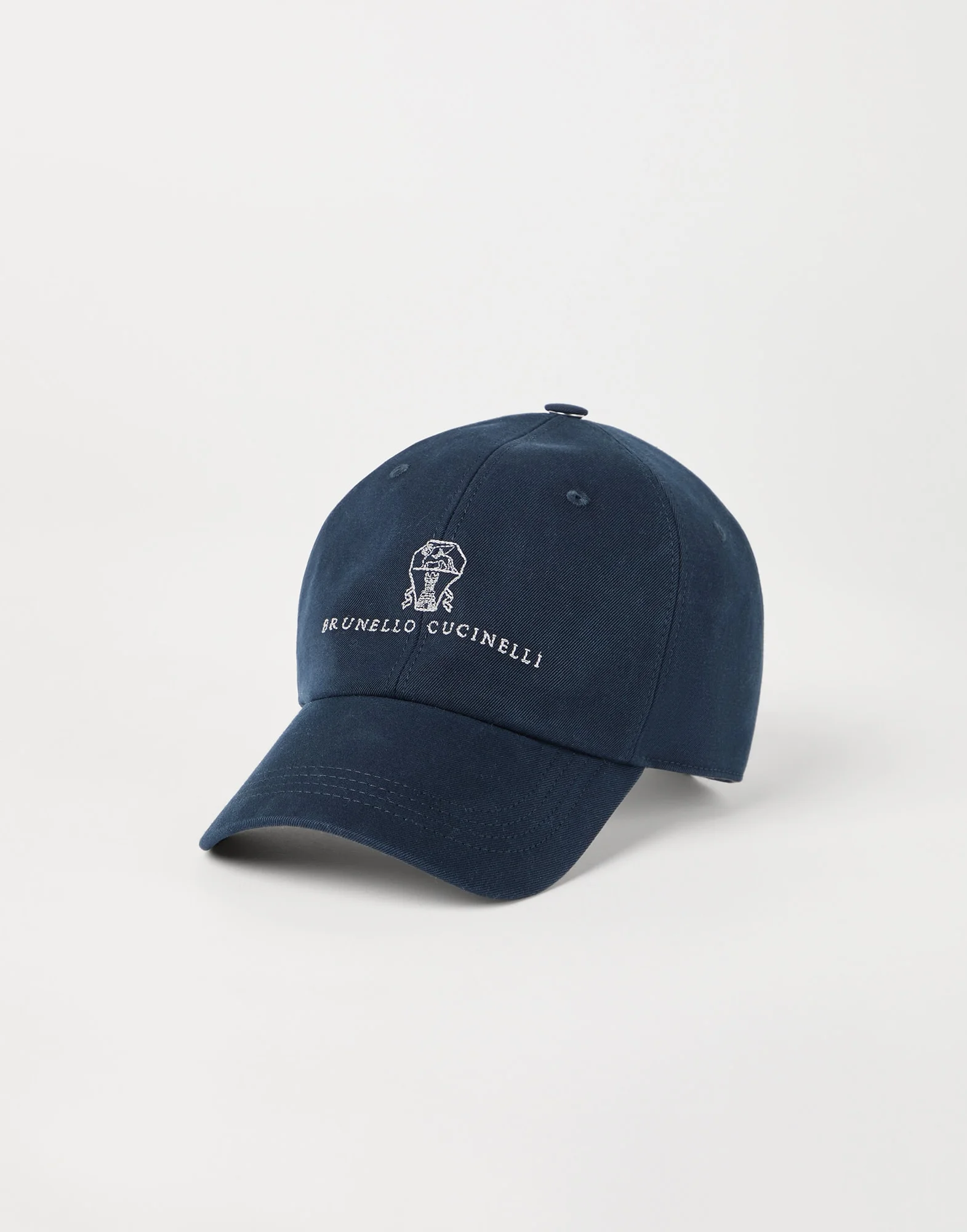 Refined Brunello Cucinelli materials enrich this garment-dyed cotton gabardine baseball cap, a must-have casual, sporty accessory of the male wardrobe. The particular craftsmanship uses twisted cotton threads that provide the design with freshness and comfort, completed by the Solomeo heraldic logo embroidered on the front. MATERIALS Pure cotton gabardine uses twisted threads that enhance the fabric’s compact, comfortable and fresh texture. Garment dyeing adds slight color shading that is visible in particular along the edges of the garment and seams. DETAILS Reinforced brim Adjustable strap with buckle 100% COTTON