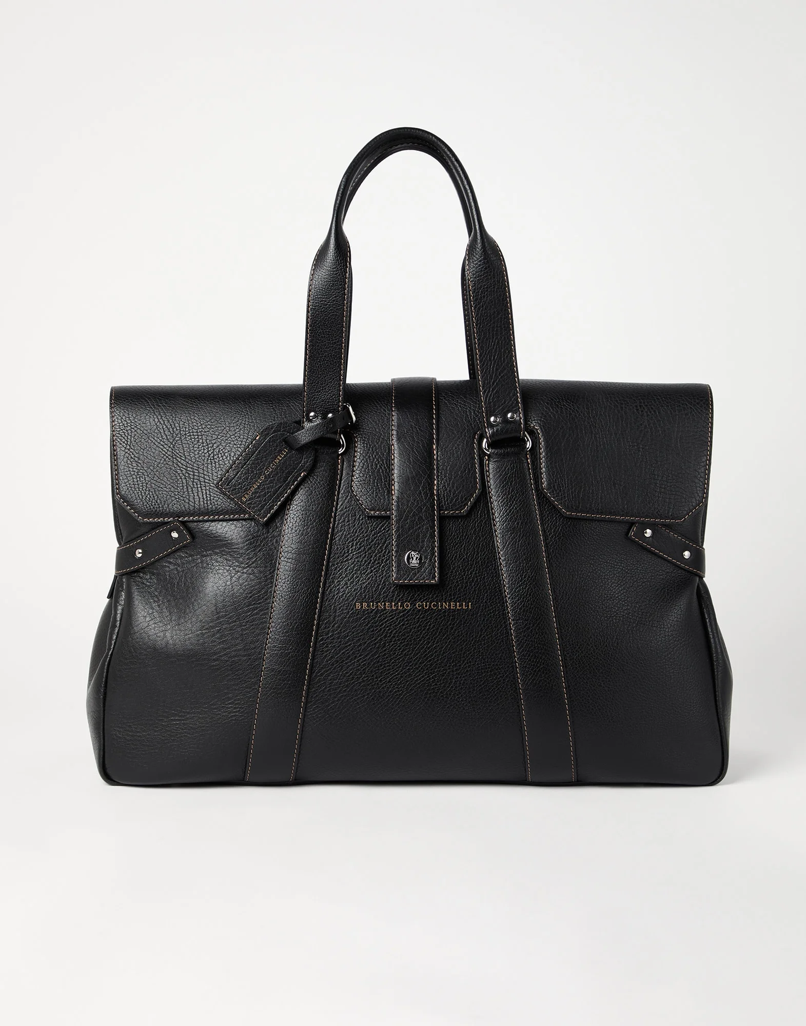 An elegant accessory designed for out-of-town trips, this Weekender Country bag combines luxurious materials and refined details to create sophisticated texture and color contrasts. The calfskin’s distinct irregular grain defines its vintage-inspired feel, while the double handle and shoulder strap make it versatile and practical. The interior is equipped with a fabric lining that protects the contents from contact with water. MATERIALS Manufacturing of the grained calfskin enriches the texture with slightly uneven coloring, giving the look of the leather a “vintage” feel. Inside, the accessory is lined in fabric to protect its contents from any potential minimal contact with water. DETAILS Flap closure with magnetic snap Adjustable and detachable shoulder strap Double handle Water-resistant fabric lining 2 internal compartments with zippers 2 internal compartments with snaps All metal parts are Nickel-free Accessory is approx. 58 cm (22,83") long, 38 cm (14,96") high and 23 cm (9,06") wide REAL LEATHER