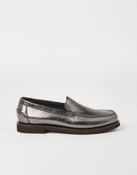 Refined materials and iconic embellishments reinterpret the masculine feel of these Penny Loafers in an elegant, modern way. The footwear’s tapered lines are enhanced by the smooth plug, highlighted by the sophisticated gathering along the edges. A precious metallic effect enriches the design, completed by a shiny monili embroidery on the heel, for a sparkling note in true Brunello Cucinelli style. MATERIALS The refined leather is enriched with a special finish that gives the texture a rich grain and a metallic effect. The non-slip TPU island and the leather bottom make the fit safe and comfortable. DETAILS Leather lining Leather sole TPU rubber tread Nickel-free monili decoration 100% REAL LEATHER