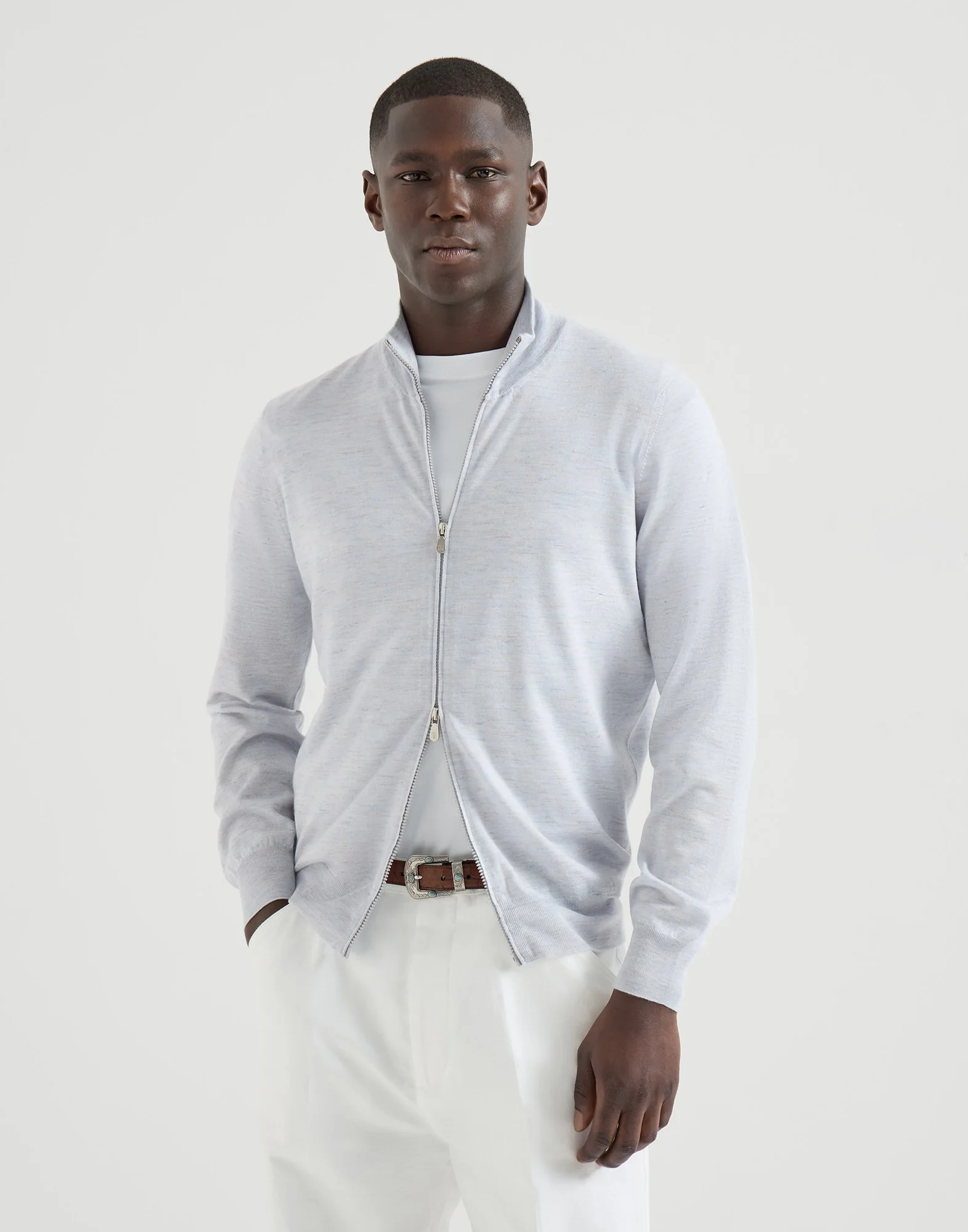 The excellence of Brunello Cucinelli yarns enhances the casual feel of this turtleneck cardigan, a must-have menswear piece. For the first time, the lightweight knitted garment blends cashmere, silk and linen fibers in a singe yarn, enriching the season's colors with a distinct irregular texture. Thanks to the zipper closure, the sweater is comfortable and particularly suitable for milder days. MATERIALS Single-ply knitting of the cashmere and silk yarn brings out the qualities of the natural fibers and provides lightness and comfort. The addition of linen enriches the season’s colors with the material’s characteristic irregular texture. The garment has a balanced weight that is particularly suited for the beginning of the season. DETAILS Two-way zip closure High collar Rib knit cuffs and bottom band Plain stitch 42% CASHMERE, 36% SILK, 22% LINEN