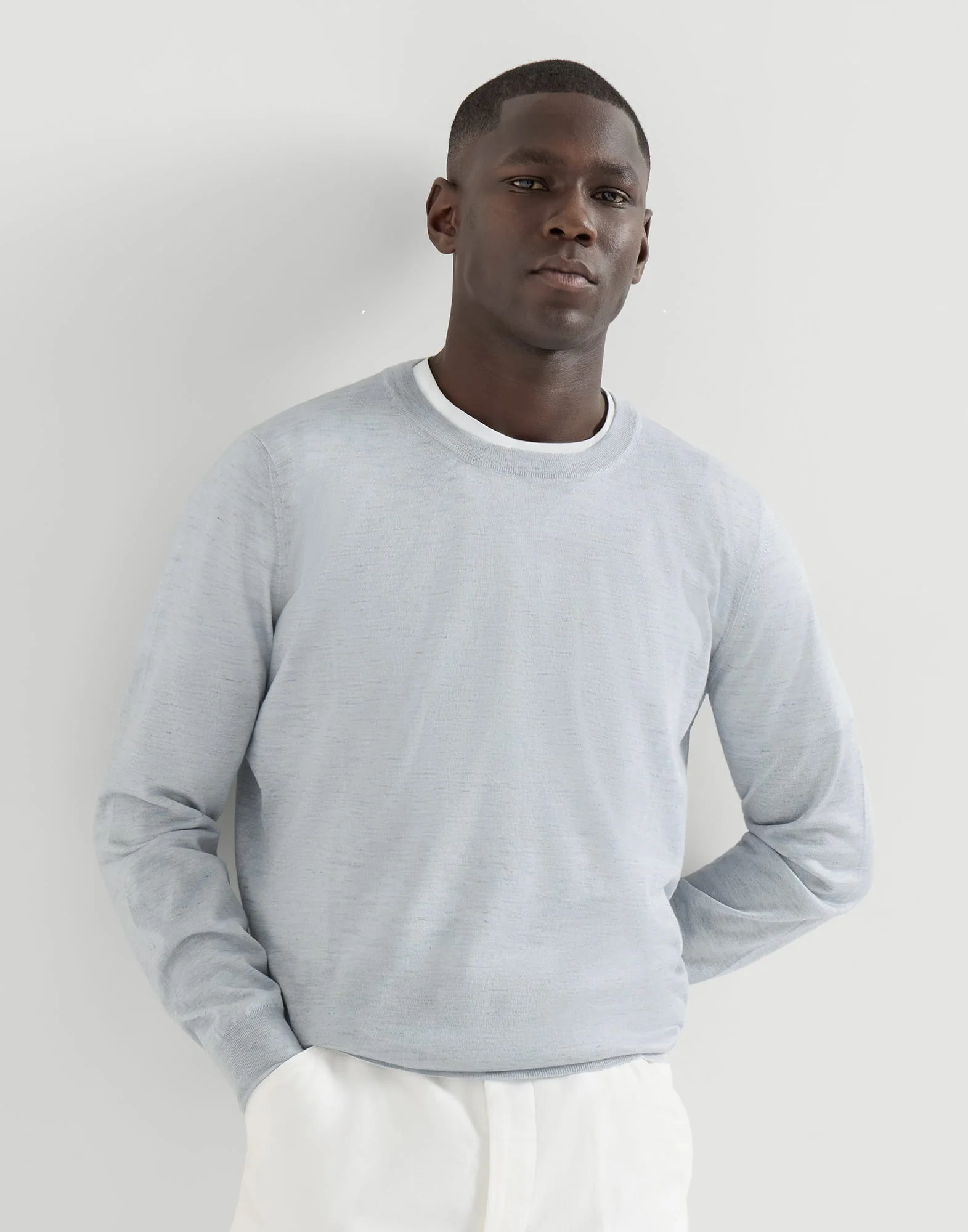 The excellence of Brunello Cucinelli yarns enhances the essential lines of this long sleeve sweater, a must-have menswear piece. For the first time, the lightweight knitted garment blends cashmere, silk and linen fibers in a singe yarn, enriching the season's colors with a distinct irregular texture. With a comfortable fit, the sweater is particularly suitable for milder days. MATERIALS Single-ply knitting of the cashmere and silk yarn brings out the qualities of the natural fibers and provides lightness and comfort. The addition of linen enriches the season’s colors with the material’s characteristic irregular texture. The garment has a balanced weight that is particularly suited for the beginning of the season. DETAILS Crew-neck in rib knit Raglan sleeve Rib knit cuffs and bottom band Plain stitch 42% CASHMERE, 36% SILK, 22% LINEN