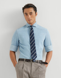 The sporty feel of lightweight cotton denim adds a casual touch to the classic, versatile style of this spread collar shirt. The easy fit is characterized by regular, rather straight lines and has a slightly shorter length than other fits, making it ideal to wear over trousers for a casual look. MATERIALS The pure cotton denim is characterized by a balanced weight that makes this garment comfortable to wear, particularly in warmer weather. DETAILS Placket closure with mother of pearl buttons Spread collar Cuffs have one mother of pearl button Easy fit 100% COTTON