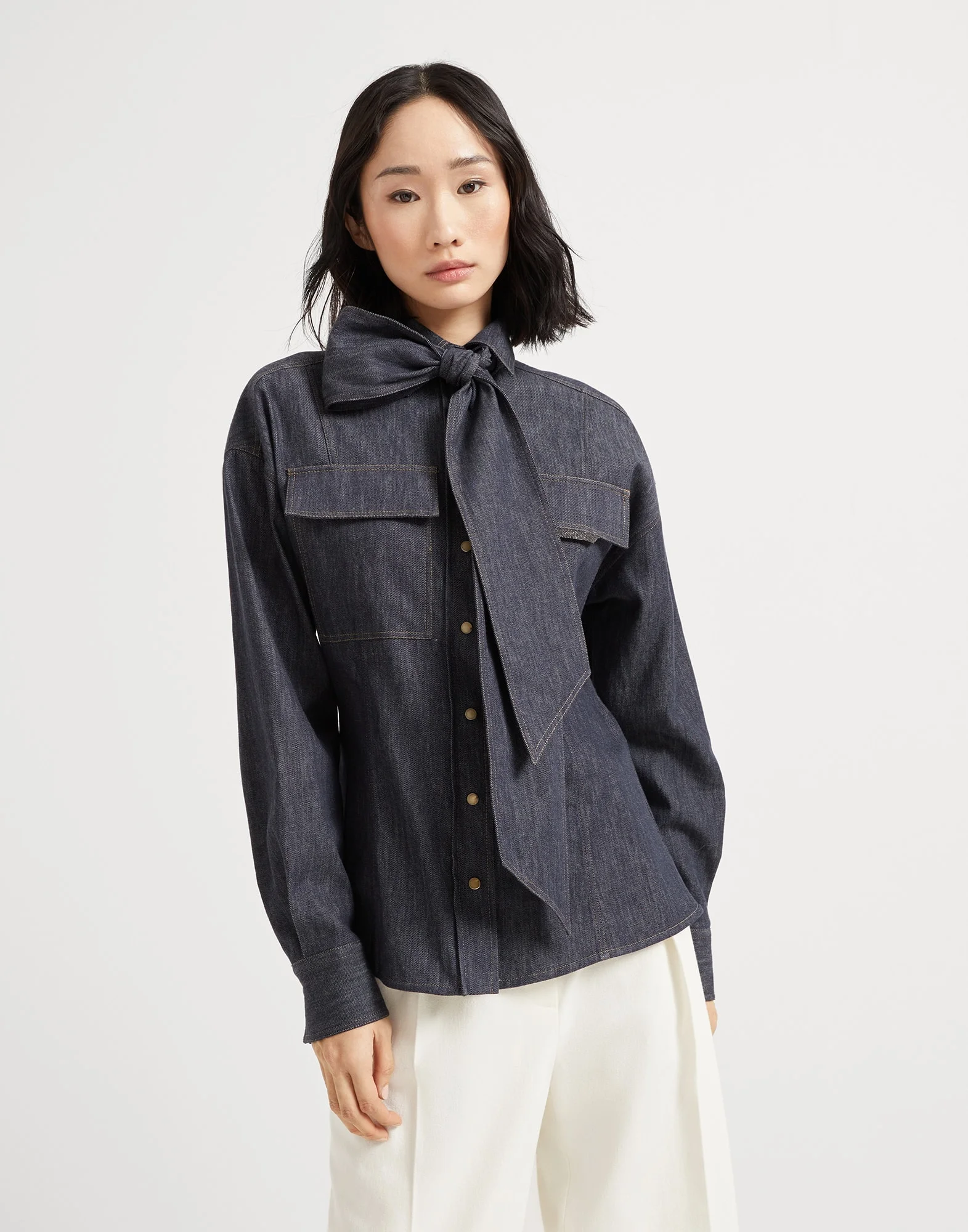 A sophisticated mix of styles defines this new no-fade denim shirt. Inspired by menswear, the style features visible contrast stitching that emphasizes the chest pocket, while the delicately knotted pussybow on the front adds a note of refined elegance with a distinctly feminine feel. The silhouette offers slightly fitted proportions at the waist, while the precious monili embroidery completes the garment with a distinctive sparkling note in true Brunello Cucinelli style. MATERIALS The new pure cotton no-fade denim has an extraordinarily light texture and a dark color that does not lighten after washing. DETAILS Horn snap closure Classic collar Two patch chest pockets with flap Snap at cuffs Removable square scarf Nickel-free monili decoration 100% COTTON