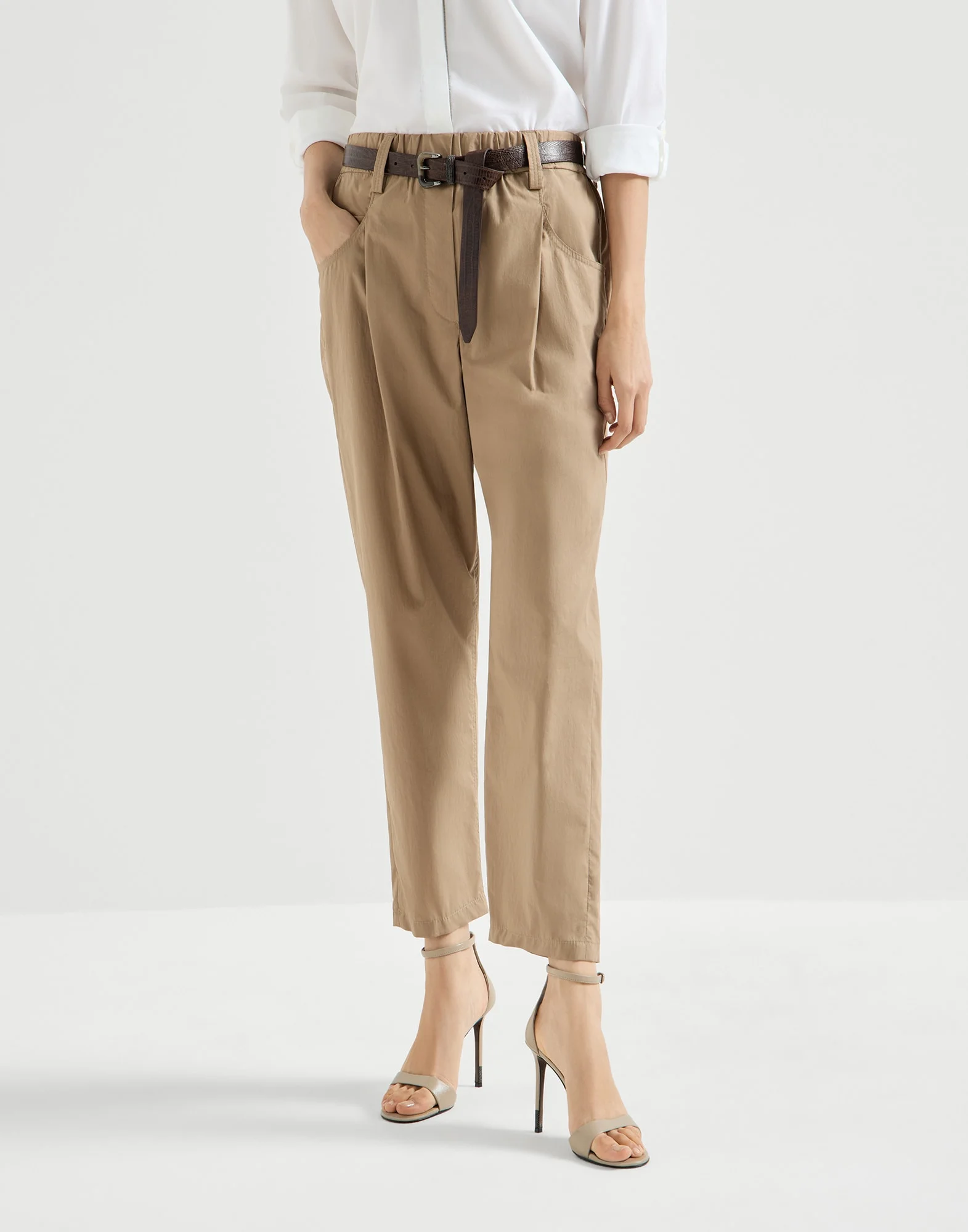 The distinctive materials of the Brunello Cucinelli collections define these five-pocket Track trousers. A classic fabric from the world of shirting, cotton poplin enhances the garment’s casual, summery style, characterized by a soft silhouette and a practical elasticized waistband. A precious monili embroidery enriches the garment with a refined, feminine sparkle. MATERIALS A classic shirting fabric, the lightweight pure cotton poplin is fresh and comfortable to wear. DETAILS Pull-up trousers Front pockets with watch pocket Pleat Back patch pockets Plain hem Nickel-free monili decoration 100% COTTON