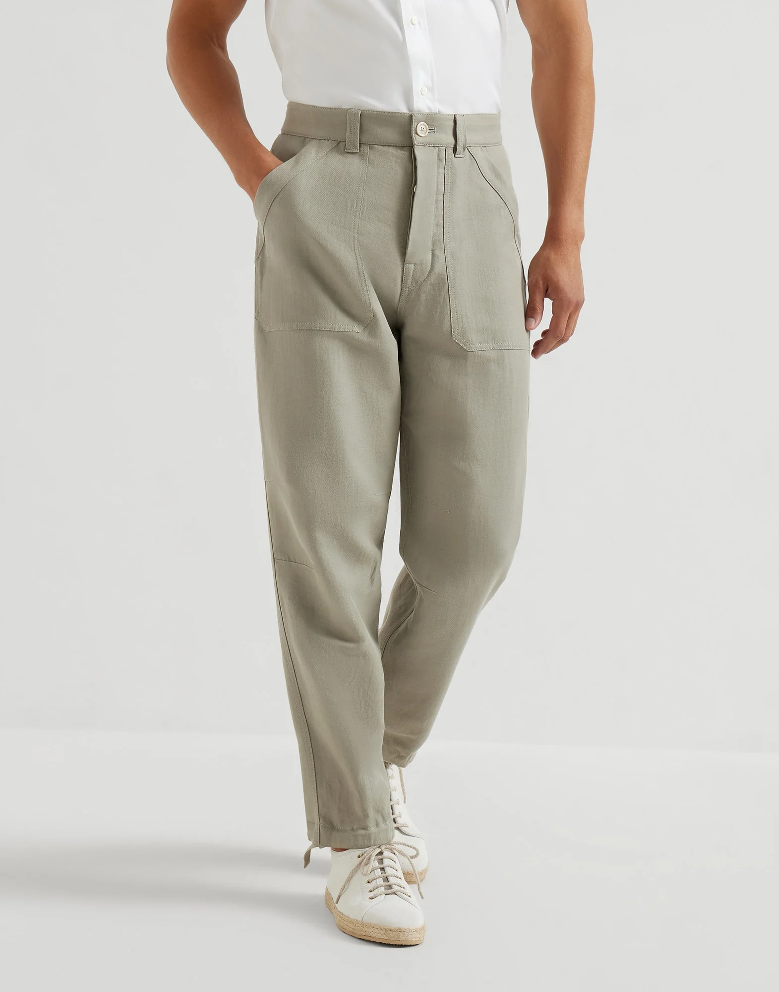 The contemporary spirit of these relaxed fit cotton and linen drill trousers is expressed through the balance of fine yarns and sportswear-inspired details. The soft proportions feature wide lines in the hips that run comfortably down the leg. The patch pockets, drawstring waist and adjustable grosgrain cuffs enrich the design’s informal feel with functional elements. MATERIALS The sporty feel of drill is delivered in a cotton and linen version with a compact yet lightweight texture that showcases the classic diagonal twill weave. The linen fibers enhance the fabric with a slightly mottled effect, accentuating its casual, versatile nature. DETAILS Button closure Front pockets Drawstring hem 56% LINEN, 44% COTTON