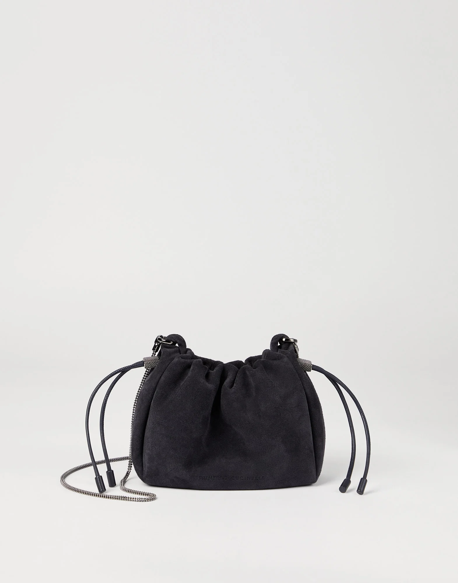 The velvety look of suede and feminine embellishments define the classic feel of this mini Bucket Mellow bag. The leather’s velvety hand perfectly complements the bag’s minimalist lines, which are gathered by the drawstring closure. Four rows of precious monili are joined together to create the shoulder strap, illuminating the accessory with radiant reflections in true Brunello Cucinelli style. MATERIALS The refined suede has an elegant, sophisticated appearance characterized by its unmistakable velvety, slightly uneven texture. DETAILS Drawstring closure Shoulder strap Suede lining 1 slot for cards and business cards All metal parts are Nickel-free Bag is 26 cm (10.24") long, 6.5 cm (2.56") wide, and 14 cm (5.51") high REAL LEATHER