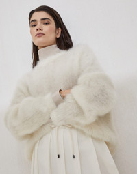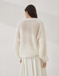 Soft and weightless, this mohair and silk sweater provides a warm, cozy sensation. The natural sheen of silk enhances the airy effect of mohair, giving the garment a precious, ethereal texture. The comfortable, essential silhouette is characterized by dropped shoulders and generous sleeves. MATERIALS The refined yarn combines the lightness of airy mohair and the elegant sheen of silk. Warm and weightless, it wraps gently around the body, offering a pleasant sense of comfort when worn. DETAILS Crew-neck Drop shoulder Wide sleeve Various knit stitches 80% MOHAIR, 20% SILK
