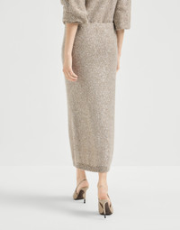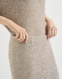 Clean, feminine lines are paired with refined embroidery in this mohair and wool dazzling texture skirt. A cascade of shiny sequins spreads a delicate glow throughout the garment’s surface, sparkling with every movement. The pull-on fit provides added comfort, while straight, fitted proportions enhance the silhouette. MATERIALS The intense reflections spread by the small sequins embedded into the yarn elevates the knit, made of a mohair-blend yarn with a soft, warm and cozy feel. DETAILS Pull-up skirt Elastic waistband Reverse plain stitch Silk-blend crepe lining Rib knit hem 52% NYLON, 37% POLYESTER, 11% MOHAIR