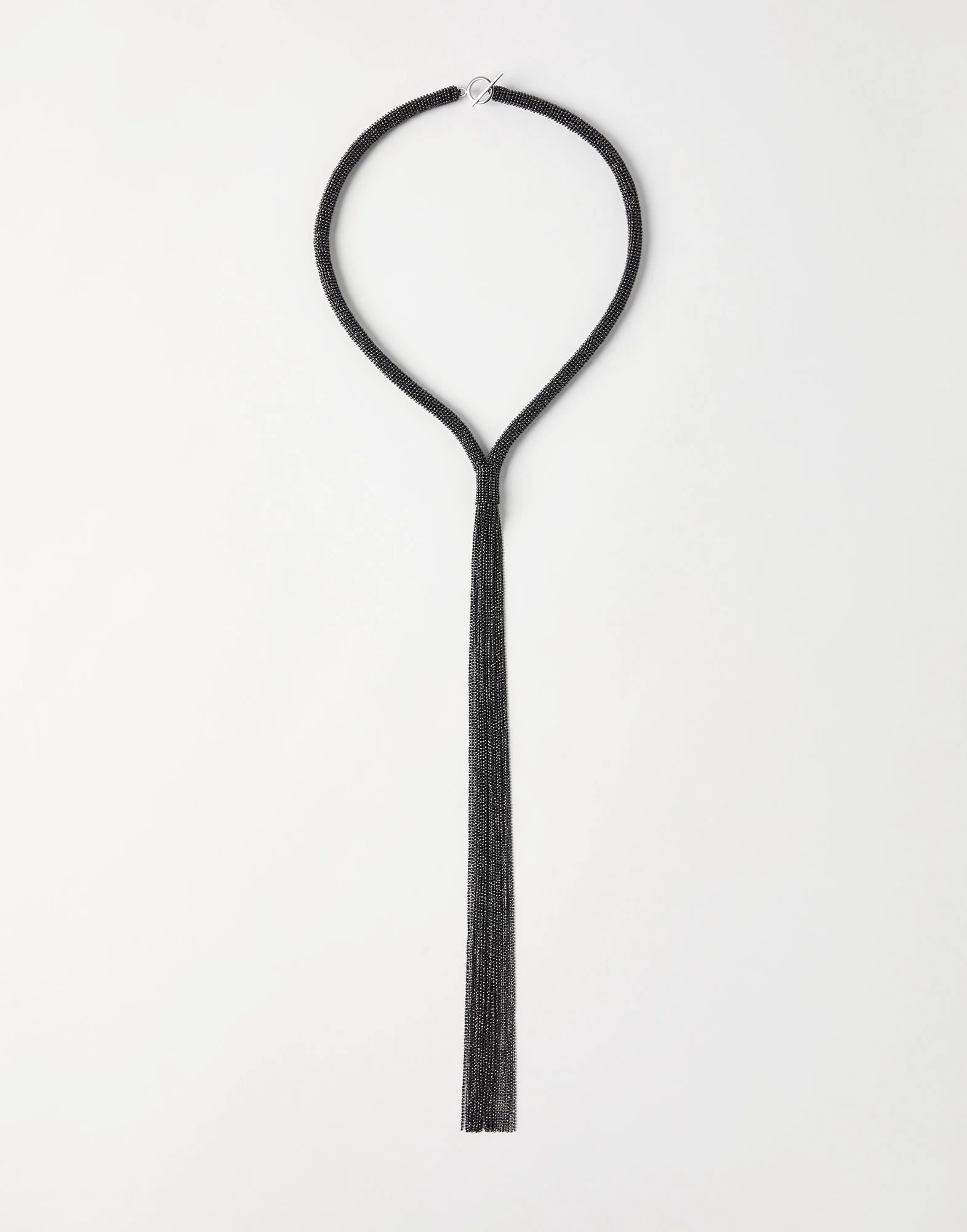 Monili, the iconic element of the Brunello Cucinelli collections, enriches the new necklace with an elegant play of shiny reflections. The tubular necklace is paired with fringe in the center that uses long, fluid rows of monili to create a sparkling contrast of light. MATERIALS Monili, the iconic earmark of the Brunello Cucinelli collections, consists of fine rows of brass beads plated in different finishes. The faceted edge of the beads emphasizes the shiny tones of the monili. All of the metal components are covered with precious materials which completely replace Nickel, enriching the excellence of every single detail. DETAILS Ring and toggle fastening Nickel-free monili decoration Accessory is approx. 54 cm (21.26") BRASS