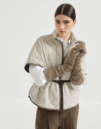This new quilted cotton and cashmere corduroy outerwear jacket pairs refined materials and country inspiration. The soft yet sporty texture of corduroy enriches the quilted surface, while the short, wide sleeves are perfect for creating elegant layering. The shiny monili embroidery, the iconic embellishment of the Brunello Cucinelli collections, illuminates the zipper with a delicate note of feminine sparkle. MATERIALS Thanks to a very delicate process that preserves the qualities of the fibers, the corduroy combines cotton and cashmere to achieve an extremely soft, smooth texture. The Thermore® padding gives the garment the right amount of comfort and protection. DETAILS Two-way zip closure Water-resistant nylon lining Hand pockets with snap Interior waist drawcord Thermore® padding Nickel-free monili decoration 95% COTTON, 5% CASHMERE