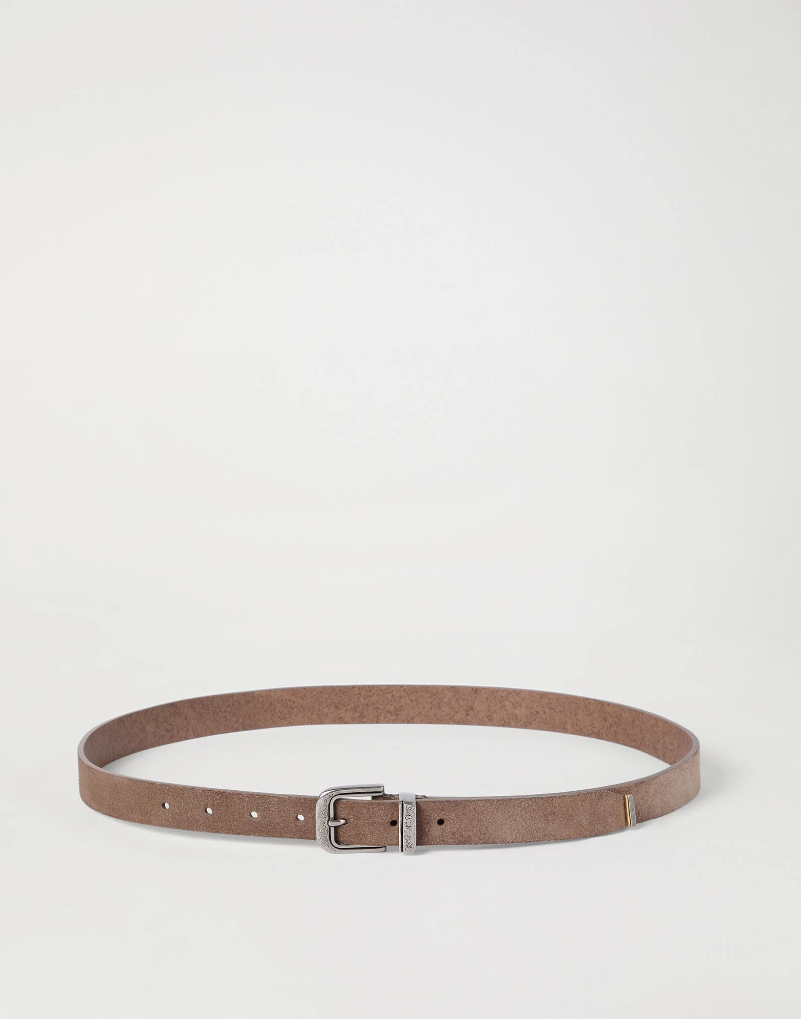 The velvety, slightly uneven texture of rough-out leather enriches this new belt with a retro touch. The buckle, loop and tip showcase a refined engraved pattern that enhances the metal’s slightly aged effect. MATERIALS Reverse leather is soft and suede-like with a slightly uneven texture. DETAILS Belt height approx. 2.5 cm (0,98") All metal parts are Nickel-free REAL LEATHER