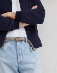 Vintage inspiration defines this reversed leather belt thanks to the metal components of the buckle and tip, enhanced with distinctive raised workmanship. The leather’s surface is slightly irregular and unique to each accessory for a casual, unmistakable touch. MATERIALS Reverse leather is soft and suede-like with a slightly uneven texture. DETAILS Belt height approx. 2 cm (0.79") All metal parts are Nickel-free REAL LEATHER