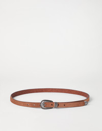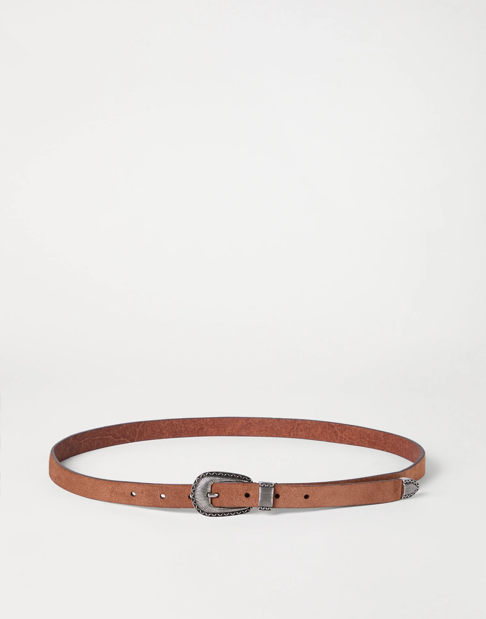 Vintage inspiration defines this reversed leather belt thanks to the metal components of the buckle and tip, enhanced with distinctive raised workmanship. The leather’s surface is slightly irregular and unique to each accessory for a casual, unmistakable touch. MATERIALS Reverse leather is soft and suede-like with a slightly uneven texture. DETAILS Belt height approx. 2 cm (0.79") All metal parts are Nickel-free REAL LEATHER