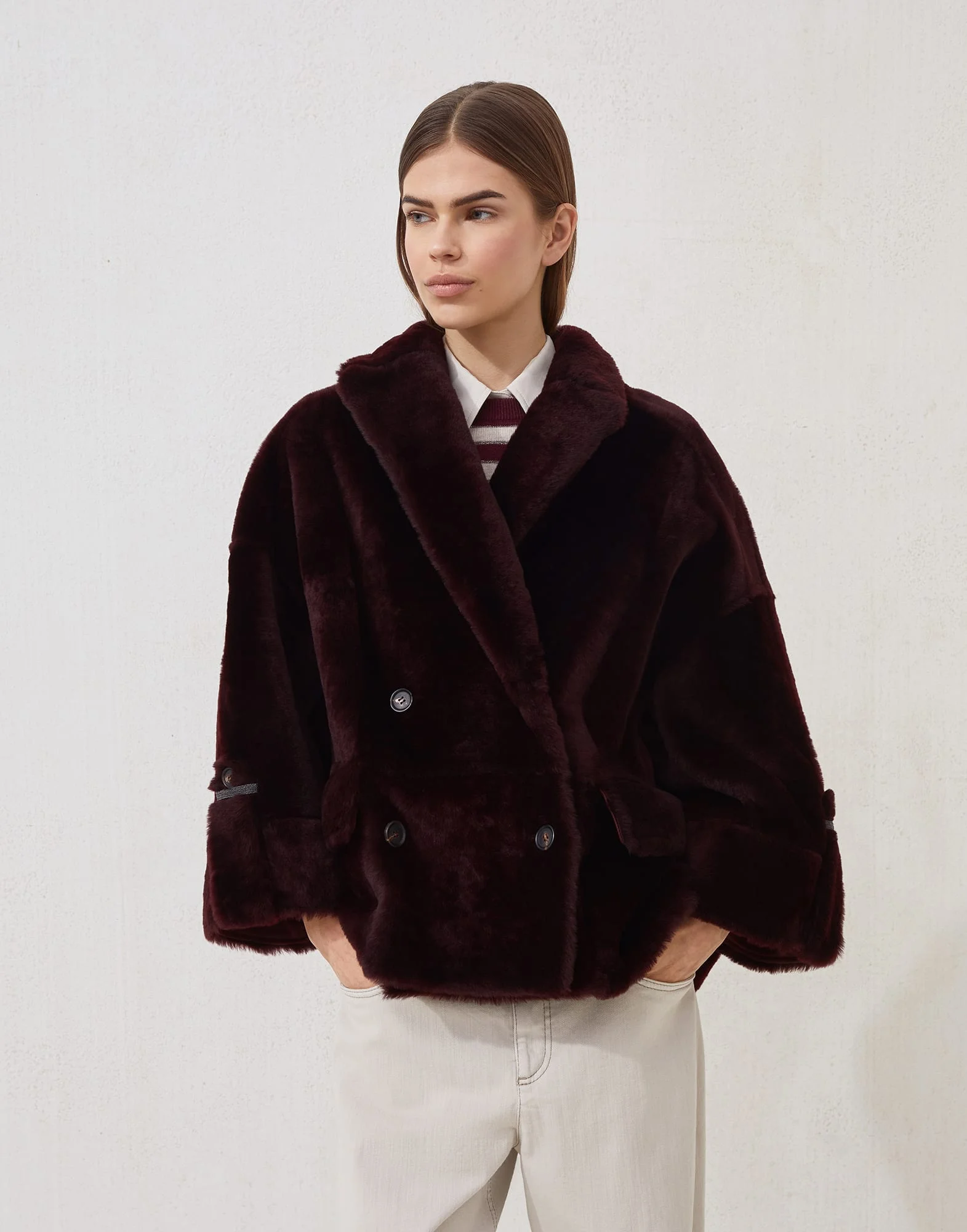 Refined Brunello Cucinelli materials enrich this new reversible shearling outerwear jacket. The garment features a soft and cozy surface on the one side, alternating with a compact, Nappa-effect texture on the other side, conveying versatile and textural elegance. The voluminous silhouette is enhanced by large lapels and the double-breasted closure. A precious monili insert illuminates the sleeves with an elegant feminine note. MATERIALS Manufacturing of the soft leather provides a very supple and regular final effect. The reverse side is characterized by a pleasant, slightly nappa-like look. DETAILS Horn button closure Inner side in leather Notched lapel Hand pockets with flap Cuffs with horn button Nickel-free monili decoration SHEARLING