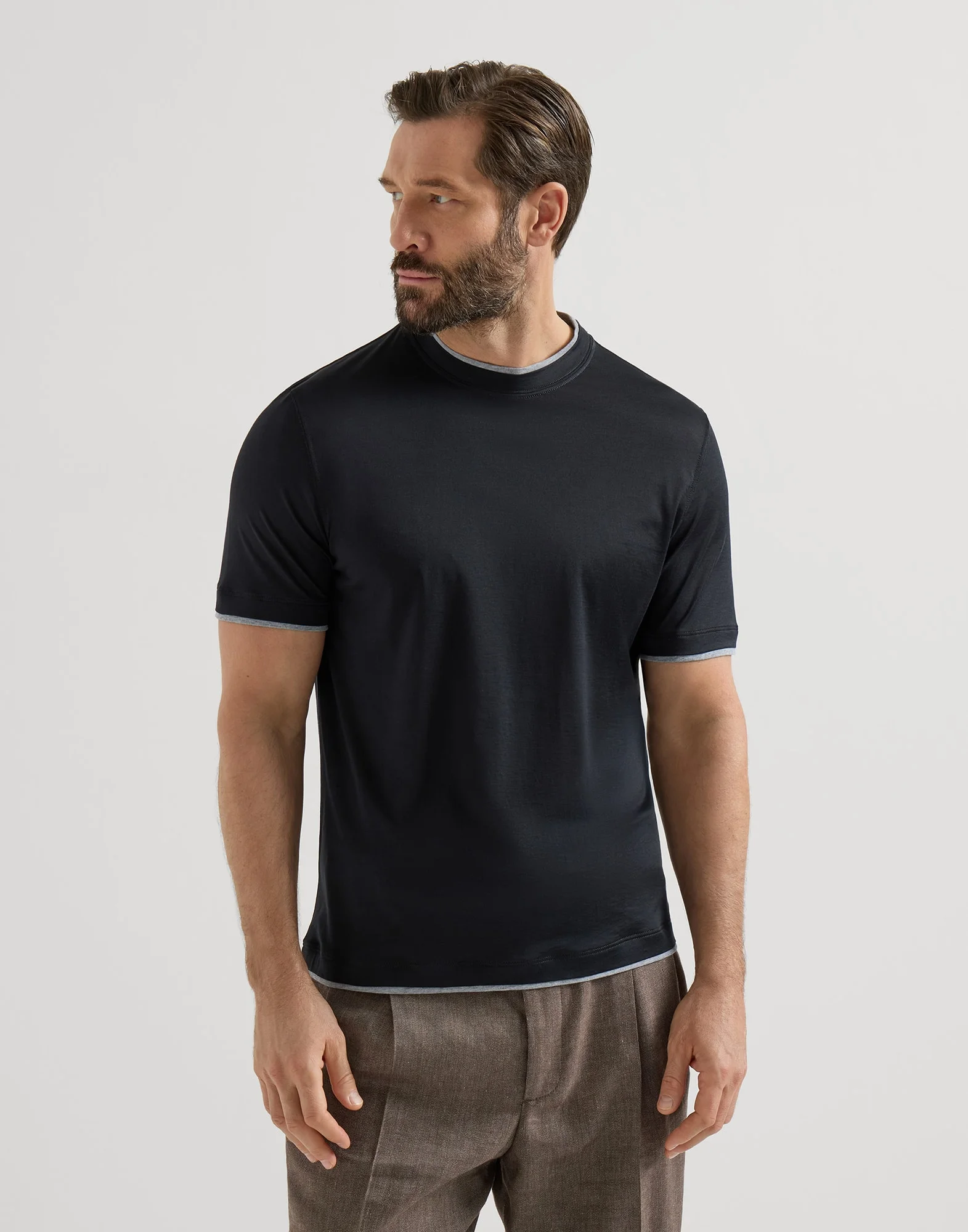Casual details and elegant fabrics enrich the classic style of this crew-neck T-shirt. The lightweight silk and cotton jersey’s smooth texture is paired with contrasting inserts that stand out on the edges of the neckline and sleeves to create a faux-layered effect with a sporty feel. The silhouette features regular proportions. MATERIALS The smooth, lightweight jersey fabric combines the qualities of the noble silk fibers, which gives a slight shiny effect to the fabric, with the compact and fluid appearance of cotton. DETAILS Crew-neck Sleeves with flat pressed hem Flat pressed hem Regular fit 62% SILK, 38% COTTON
