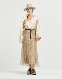 Seasonal motifs and refined materials bring this paneled circle skirt to life. A classic tailored chevron is delivered in an elegant, feminine print: the lines of the design, like light brushstrokes, provide a sense of movement and enhance the garment’s airy look, while maintaining the timeless allure of the iconic herringbone pattern. The thin panels of layered organza create a distinctly summery, ethereal silhouette. MATERIALS The refined pure silk organza is characterized by an ultra-lightweight, semi-transparent texture with a crisp hand. DETAILS Back zip closure Silk-blend crepe lining 100% SILK