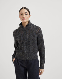 Refined materials and feminine details enrich this soft wool, cashmere and mohair dazzling rib cardigan. Featuring a relaxed fit, the style showcases a sophisticated perforated rib knit that gives the garment an exceptional lightness. The soft wool, cashmere and mohair fibers enhance softness and comfort, while the small sequins embedded in the yarn embellish the sweater’s surface with a note of shimmering elegance. MATERIALS The yarn combines the softness of virgin wool fibers, the delicate touch of cashmere and the full appearance of mohair to create a cozy garment with an extremely plush hand. A small percentage of synthetic fiber helps to maintain the structure and provides added comfort. DETAILS Two-way zip closure Funnel neck Drop shoulder Wide sleeve Rib knit 28% LAMBSWOOL, 26% NYLON, 22% CASHMERE, 19% POLYESTER, 5% MOHAIR