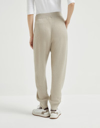 A sporty attitude and a feminine feel come together in these sparkling cashmere knit trousers. The slightly metallic effect of the lame thread enriches the timeless English rib knitting that gives the garment depth, thanks to its unmistakable raised texture. The soft volume in the seat, with a slight low-rise, falls fitted along the leg, offering a very comfortable contoured silhouette. MATERIALS The soft and lightweight cashmere Sparkling yarn combines the natural fiber’s refined qualities with a lame thread that enriches the texture with delicate shining reflections. DETAILS Pull-up trousers Front pockets English rib 76% CASHMERE, 18% VISCOSE, 6% POLYESTER