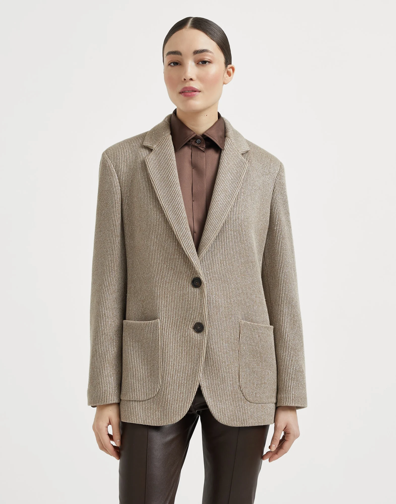 The world of knitwear is paired with a tailored feel in this new cotton and viscose Sparkling yarn blazer. Traditional English rib knitting perfectly complements the classic lapels, while the patch pockets add a relaxed note. Clean and essential, the garment’s cut showcases regular, feminine proportions. A precious monili embroidery behind the neck completes the blazer with an elegant sparkling touch in true Brunello Cucinelli style. MATERIALS Cotton and viscose are combined to create a soft, fluid fabric, enhanced by a shimmering lame thread. DETAILS Horn button closure Silk-blend crepe lining Patch hand pockets Cuffs have four horn buttons Notched lapel Nickel-free monili decoration 72% COTTON, 22% VISCOSE, 6% POLYESTER