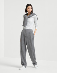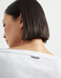 Sheen and color enrich this new long sleeve T-shirt in sparkling stretch cotton ribbed jersey. The fabric uses a lame thread that enhances the season’s colors with delicate metallic reflections, while the rib knitting emphasizes the fitted silhouette. The shiny monili embroidery, the iconic embellishment of the Brunello Cucinelli collections, completes the style with an additional sparkling note. MATERIALS A metallic thread enriches the classic rib knitting of the new stretch cotton jersey and enhances the season's colors. A small percentage of synthetic fiber provides added comfort. DETAILS V-neck Regular shoulder Regular sleeve Nickel-free monili decoration 95% COTTON, 5% ELASTANE