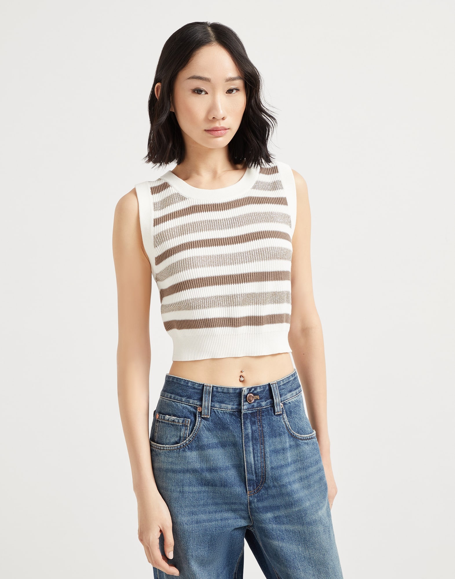 Sophisticated details and a casual attitude define the style of this knit top in striped cotton Sparkling yarn. The sporty garment is enriched with a striped pattern that pairs the season’s colors with a lame thread, elegantly playing with sparkle and texture. An embroidery of rows of shiny monili, the iconic element of the Brunello Cucinelli collections, completes the top. MATERIALS Fresh, lightweight and also comfortable, the pure cotton yarn offers the right amount of protection, particularly during the transitional months and warm weather. DETAILS Crew-neck Off-the-shoulder style English rib Nickel-free monili decoration 100% COTTON