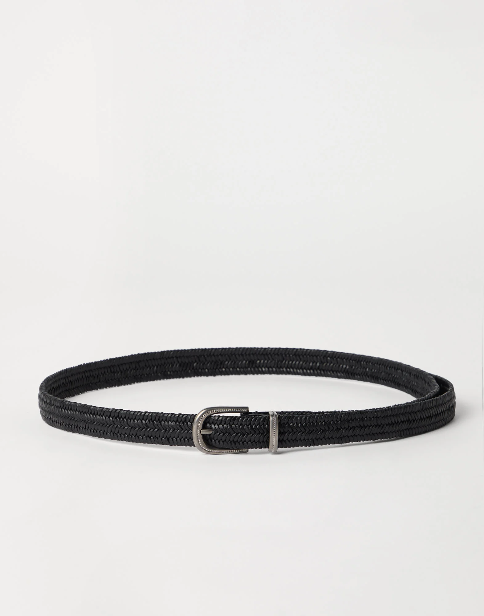The crafting of refined woven leather enriches the contemporary style of this belt with a special three-dimensional texture. The contrasting buckle and loop give the accessory a shiny note. MATERIALS The woven design of the belt is made with refined calfskin leather, characterized by a rich, even grain. The small percentage of synthetic fiber makes the leather more elastic. DETAILS Belt height approx. 2.5 cm (0.98") All metal parts are Nickel-free 70% REAL LEATHER, 23% VISCOSE, 7% RUBBER
