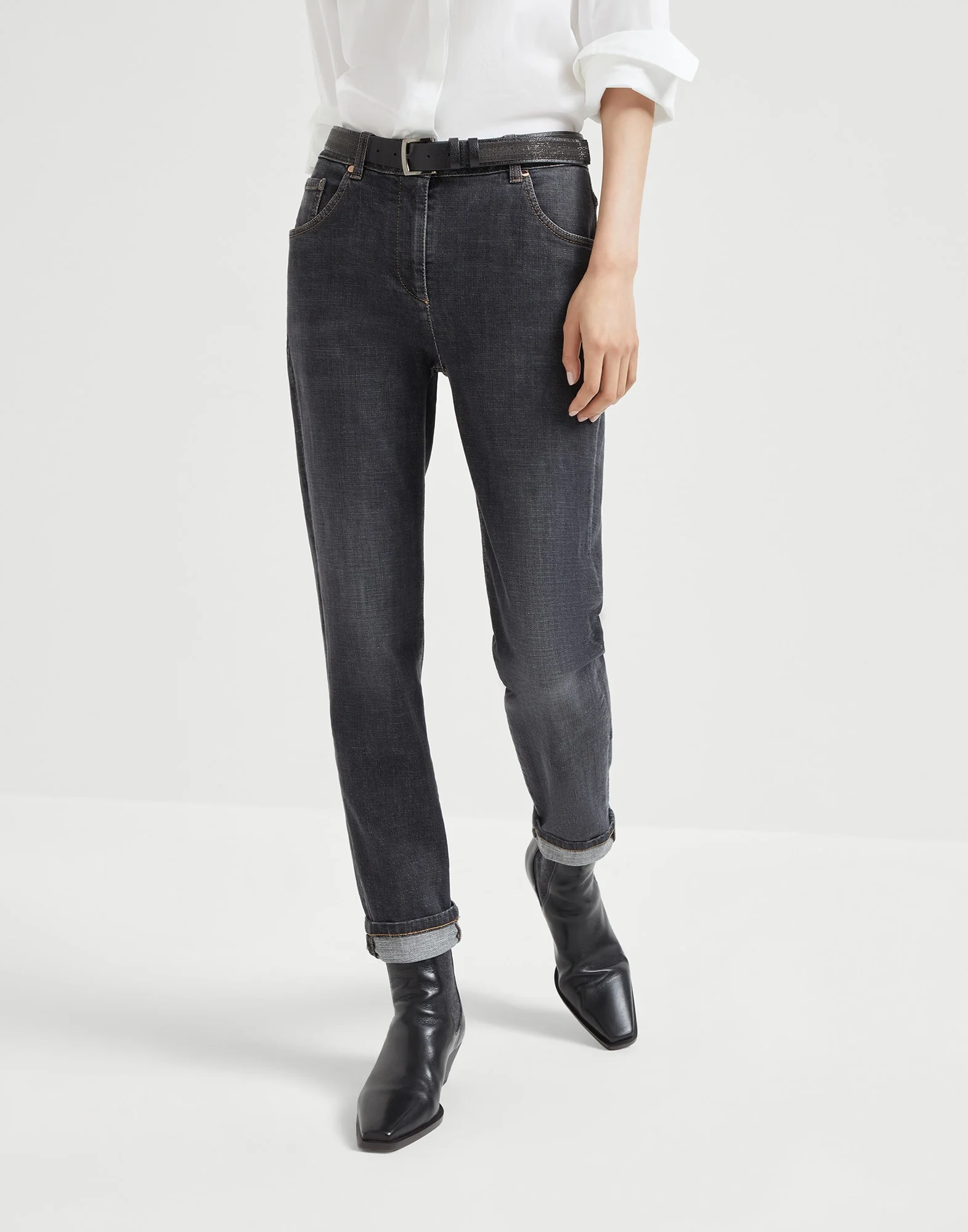 An essential, versatile design is paired with a slim fit in these denim trousers. The fabric’s iconic texture is combined with a stretch effect, perfectly complementing the fitted cut in the seat and leg. An elegant detail of the season enriches the back pocket: the embroidery of fine rows of monili on the leather tag adds a sparkling note to the garment. MATERIALS Stretch cotton denim is a lightweight and versatile fabric. A small percentage of spandex provides added comfort, particularly for styles that are fitted to the body. DETAILS Zip closure with button Front pockets with watch pocket Back patch pockets 98% COTTON, 2% ELASTANE