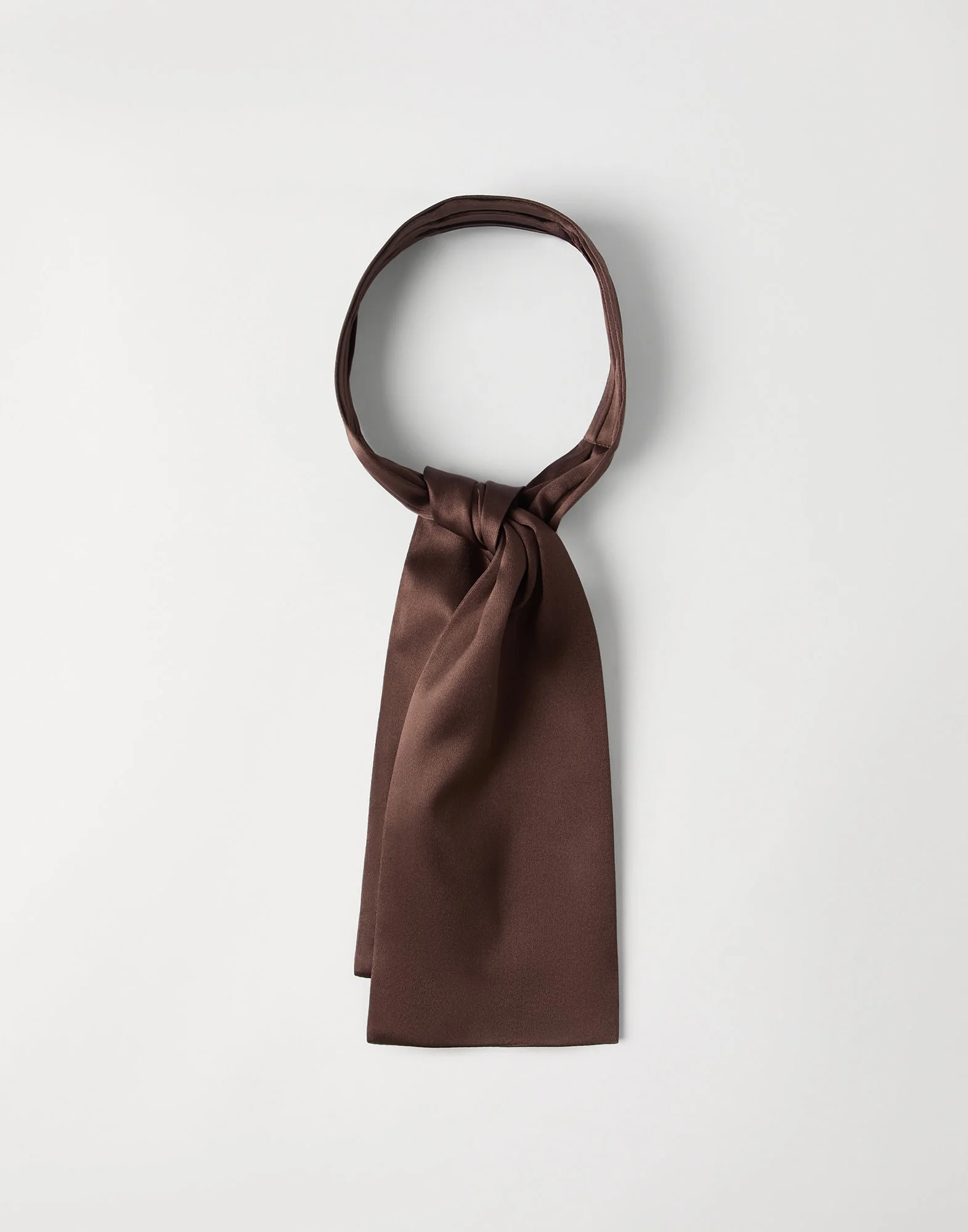 Perfect for wearing over dresses and shirts, this new stretch silk satin jabot will complete the season’s outfits with an elegant, feminine touch. The natural sheen of the fabric enhances the accessory, adding a note of understated sophistication. MATERIALS Stretch silk satin, an elegant fabric with a shiny effect and flowing hand, represents a classic of Brunello Cucinelli fine materials. A small amount of synthetic fiber adds to wearer comfort. DETAILS Accessory is approx. 84 cm 96% SILK, 4% ELASTANE