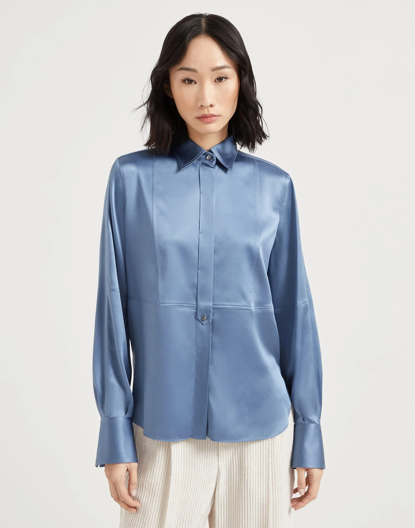 The elegance and fluidity of stretch silk satin are enriched with iconic decorations in this shirt. The garment’s classic lines are updated with the slightly shimmering effect of the luxurious fabric, while an embroidery in fine rows of shiny monili adds an elegant sparkle on the back of the neck. MATERIALS Stretch silk satin, an elegant fabric with a shiny effect and flowing hand, represents a classic of Brunello Cucinelli fine materials. A small amount of synthetic fiber adds to wearer comfort. DETAILS Mother of pearl button closure Classic collar Cuffs have one mother of pearl button Nickel-free monili decoration 96% SILK, 4% ELASTANE