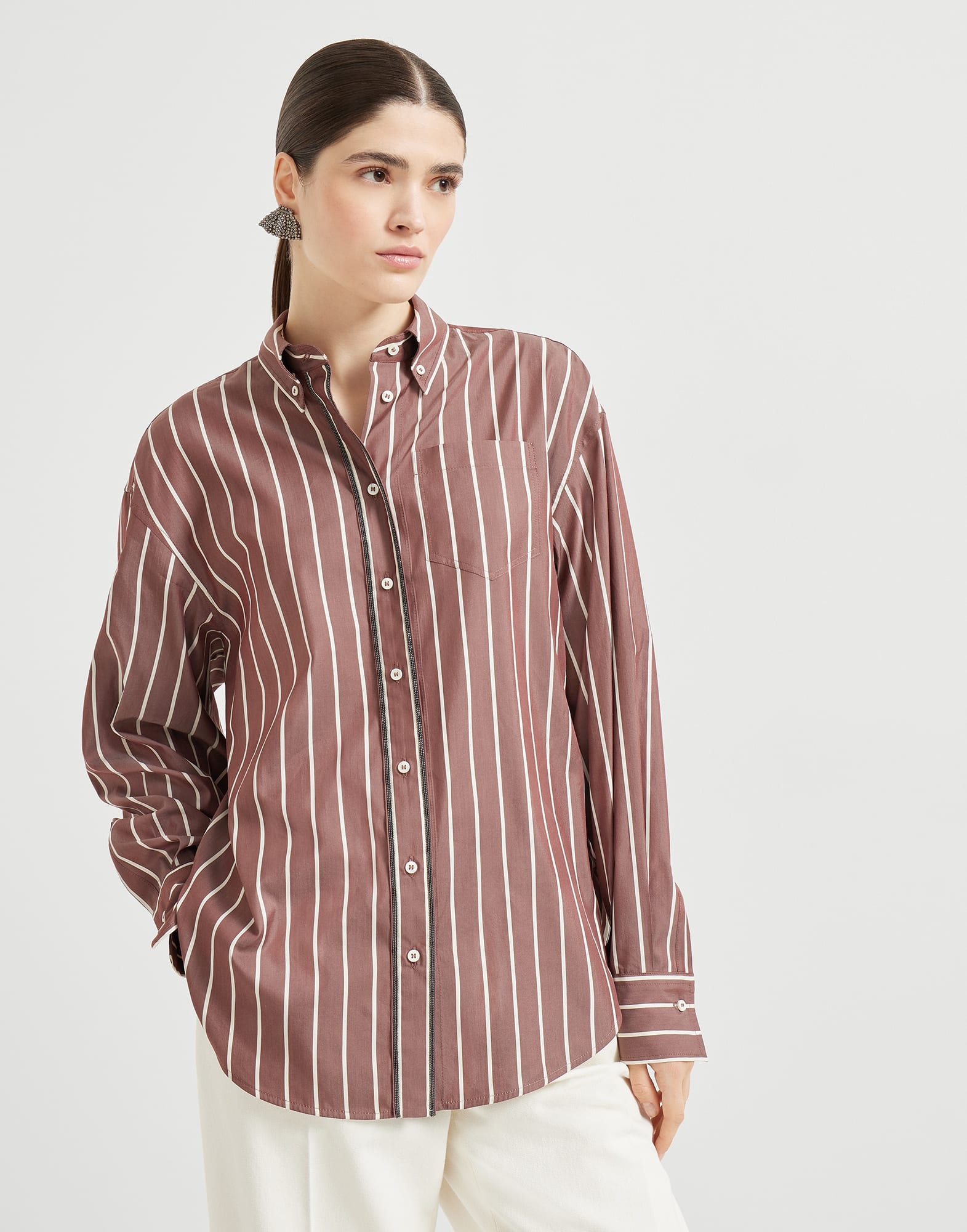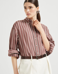 The season’s delicate colors reproduce an elegant striped pattern in this new cotton and silk poplin shirt. The style features generous sleeves that form a light balloon effect, creating a soft, feminine silhouette. A precious detail completes the garment with a sparkling touch: the placket is enriched with rows of shiny monili, the iconic embellishment of the Brunello Cucinelli collections. MATERIALS Typical of shirting, the pure cotton and silk poplin is a crisp and lightweight fabric with a smooth, fluid hand. DETAILS Button fastening with placket Button-down collar Patch chest pocket Cuffs have one mother of pearl button Nickel-free monili decoration 81% COTTON, 19% SILK