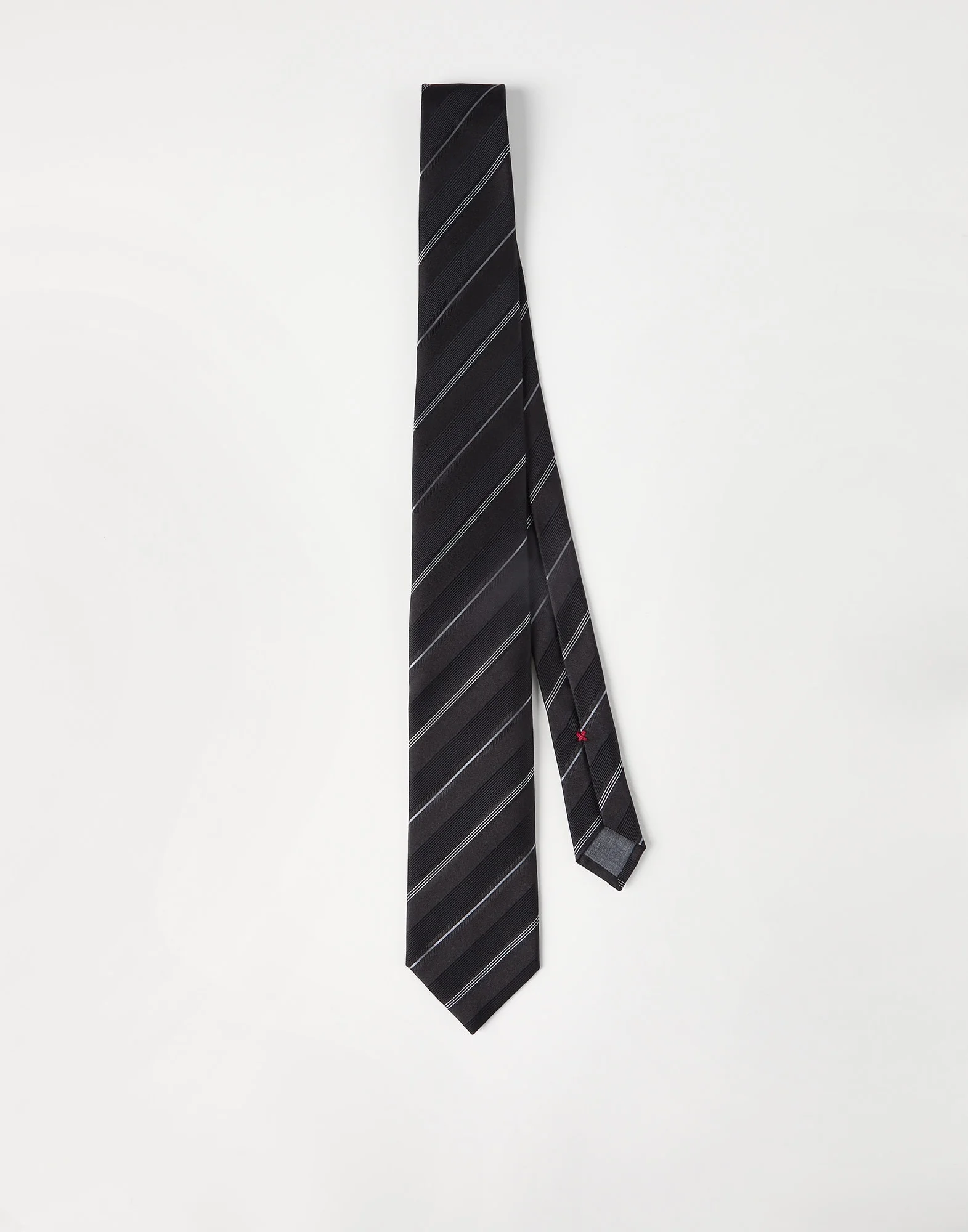 This necktie is enriched with the excellence of Brunello Cucinelli materials, delivered in smooth, glossy pure silk enriched with a classic geometric pattern in the season's colors. The cotton lining competes the accessory. MATERIALS A timeless accessory, this elegant necktie is perfect for completing looks with a personal touch. DETAILS Maximum width approx. 7.5 cm (2.95") 100% SILK