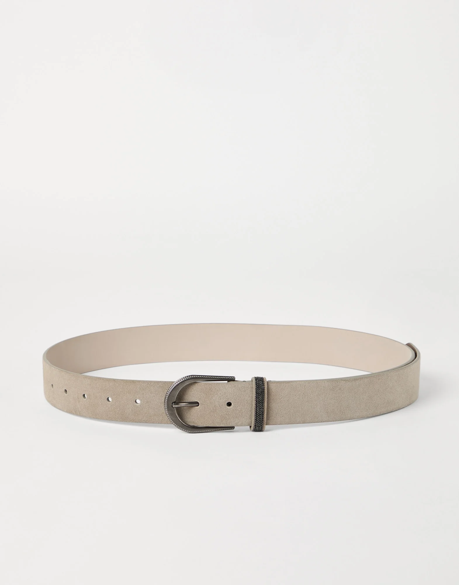 A modern silhouette and refined details characterize this new belt. Precious monili, the iconic embellishment of the Brunello Cucinelli collections, illuminates the edge of the buckle and the loop with a delicate feminine touch, pairing perfectly with the ultra soft, smooth texture of sueded calfskin. MATERIALS Sueded calfskin displays the characteristic velvety and slightly uneven texture. DETAILS Belt height approx. 3.5 cm (1,38") Nickel-free monili decoration 100% REAL LEATHER