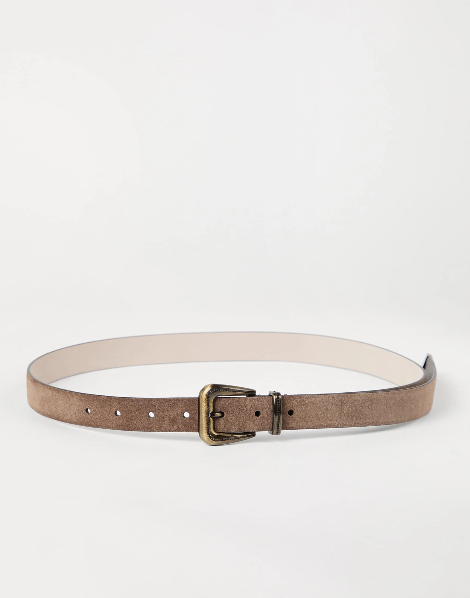 A contemporary style and an essential aesthetic characterize this suede belt. The refined leather provides a sophisticated look, while the minimal metal buckle adds a polished element. An embroidery of fine rows of shiny monili illuminates the loop and the buckle with a precious note in true Brunello Cucinelli style. MATERIALS Sueded calfskin displays the characteristic velvety and slightly uneven texture. DETAILS Belt height approx. 3 cm (1,18") All metal parts are Nickel-free Nickel-free monili decoration 100% REAL LEATHER