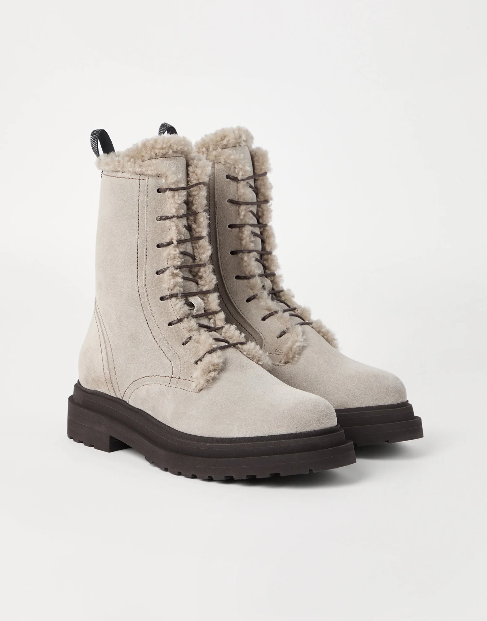 A contemporary design and feminine details define the elegant style of these new boots. Fine suede, with a soft and velvety hand, meets the plush shearling lining, highlighting the distinctly wintry feel of the design, characterized by the typical combat boot lace-up. A double loop on the back is illuminated with a shiny monili embroidery, the iconic embellishment of the Brunello Cucinelli collections. MATERIALS Refined suede is a thin leather with a soft, compact hand. The plush shearling lining and the lightweight micro outsole provide added comfort. DETAILS Round waxed fabric laces Internal side zip closure Shearling lining Sole in lightweight micro rubber The heel height measures 4 cm Nickel-free monili decoration REAL LEATHER