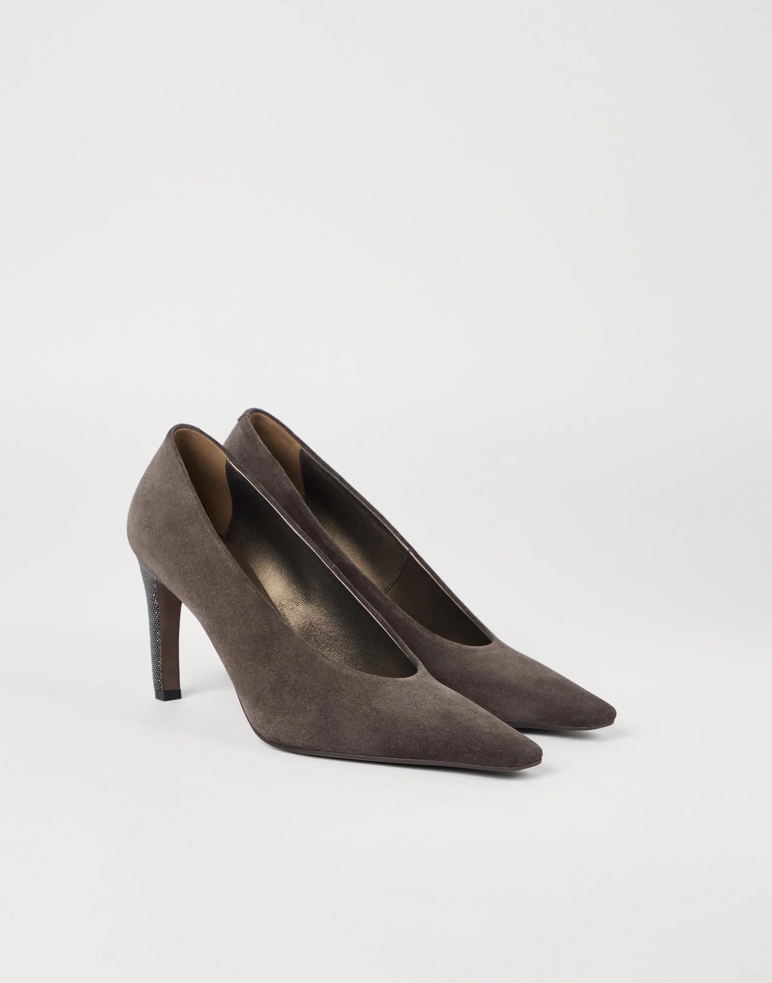 A new silhouette and precious details define these suede heels. The refined allure of suede enriches the footwear’s essential lines, characterized by an “almond” cut, creating a pleasant, comfortable sensation. The entire surface of the heel is embellished with a shiny embroidery of rows of precious monili that will leave a sparkling trail with every step. MATERIALS The light, velvety texture of suede is combined with a shiny monili detail. The leather sole provides added comfort. DETAILS Leather lining Leather sole Non-slip TPU rubber at heel and toe Nickel-free monili decoration REAL LEATHER