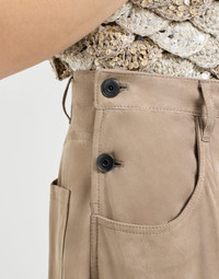 A wide, sculptural silhouette defines the elegant style of these suede maxi trousers. Inspired by classic five-pocket designs, the garment maintains a regular cut in the waist and then develops into a leg with generous volume to the bottom, creating an effect of natural fluidity and softness. The velvety, slightly shimmering texture of the suede elegantly follows every movement, giving the design a balanced harmony between relaxed and sophisticated style. A precious monili embroidery illuminates the rear belt loop with a delicate, feminine, sparkle. MATERIALS Refined suede is a thin leather with a soft, velvety hand that stands out for its naturally shimmering appearance. DETAILS Zip closure with button Side buttons for adjustment Front pockets Back patch pockets Plain hem Nickel-free monili decoration 100% REAL LEATHER