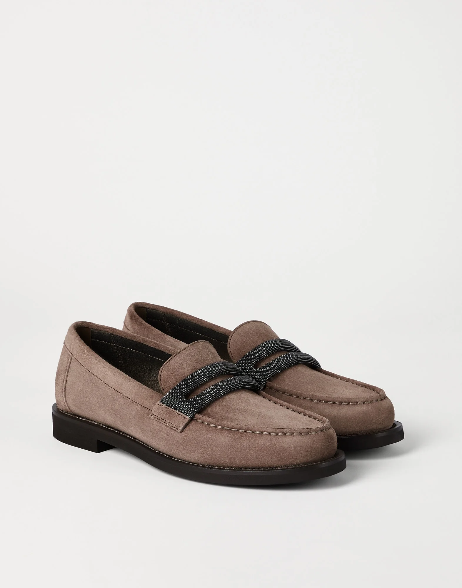 Refined materials and sparkling embellishments reinterpret the masculine style of these penny loafers in an elegant, contemporary way. The velvety texture of suede gives the footwear a sophisticated touch and enhances the season’s colors. Embroidered entirely by hand, the precious monili band adds an iconic, feminine note in true Brunello Cucinelli style. MATERIALS The refined suede is a compact leather with a soft, velvety texture. DETAILS Leather lining Sole and tread in lightweight micro rubber Nickel-free monili decoration REAL LEATHER