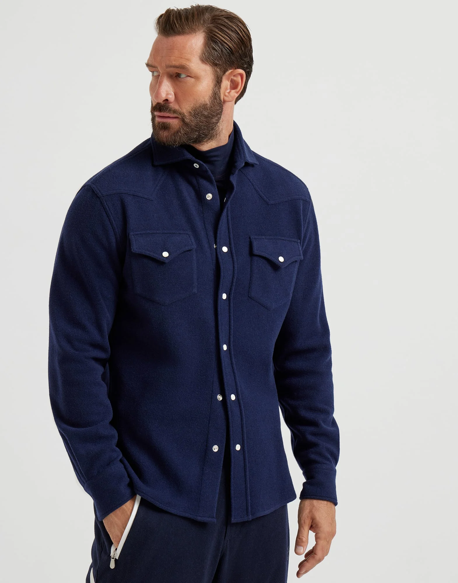 The excellence of natural fibers is reimagined in a functional, sporty silhouette, designed for apres-ski or moments or relaxation outdoors. The casual feel of this shirt with snaps is enriched with the warm and compact qualities of the cashmere and cotton fibers to ensure protection, together with a synthetic component that provides added comfort. The regular silhouette is completed with a shoulder yoke and chest pockets. MATERIALS The techno fabric is a lightweight, compact material inspired by the classic materials of athletic wear. The mix of cotton and cashmere threads ensures lightness and a distinct feeling of softness, while maintaining comfort and elasticity thanks to a small percentage of synthetic fiber. DETAILS Placket closure with snaps Classic collar Two patch chest pockets with flap Yoke Cuffs have two mother of pearl buttons 57% CASHMERE, 37% COTTON, 6% NYLON
