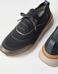Inspired by the refined yarns of Brunello Cucinelli knitwear, these new techno cotton knit runners update the feel of classic styles in a contemporary way. The heat-sealed trim stands out next to the fine, comfortable appearance of the knit: this sophisticated combination creates an elegant texture contrast. MATERIALS The cotton knit combines natural and synthetic fibers as well as a small percentage of spandex to provide optimal comfort. Its unlined construction and EVA bottom offer lightness. DETAILS Flat cotton laces Fabric lining Detachable insole TPU rubber sole 100% COTTON