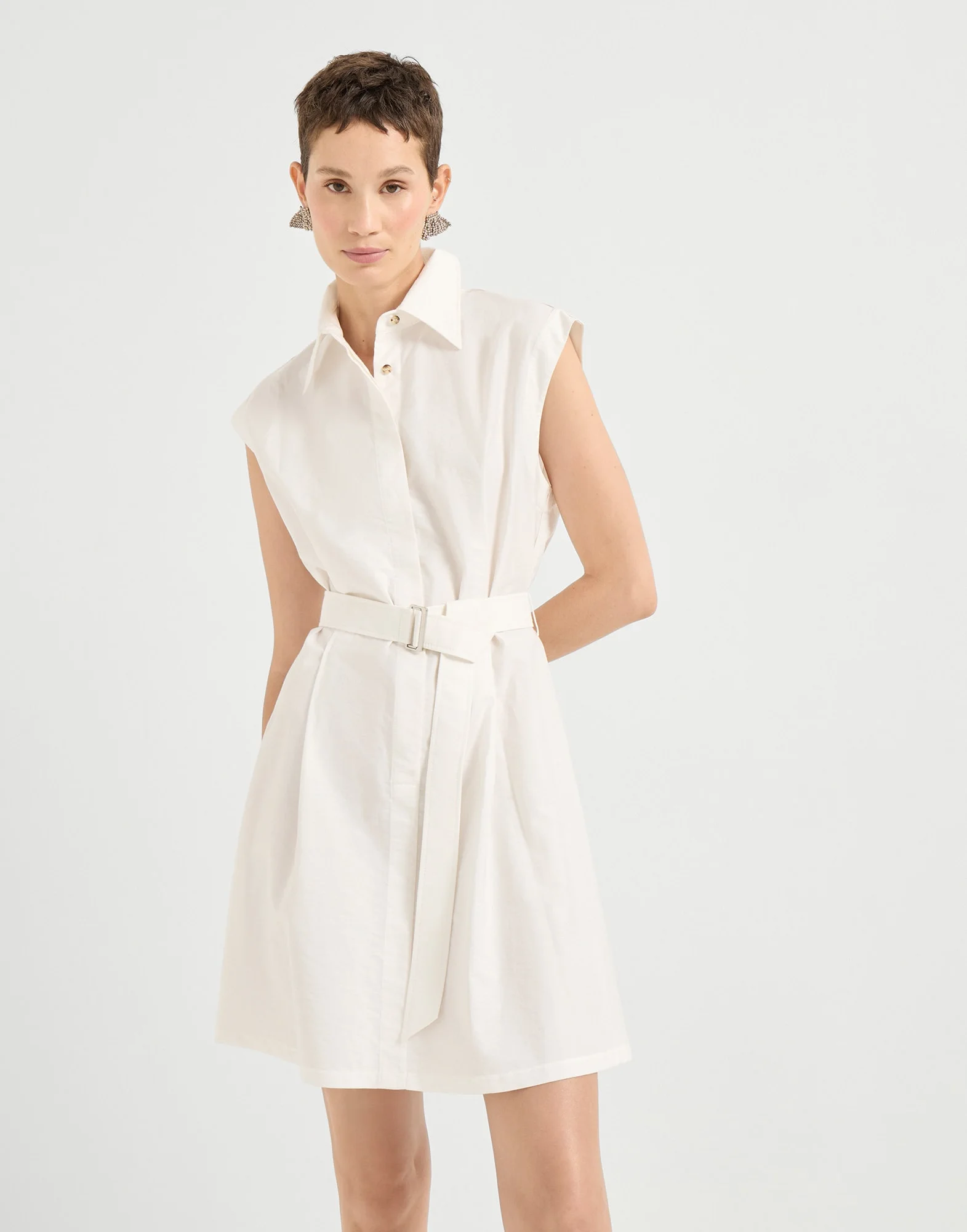 A casual feel and a distinctly feminine attitude define the style of the new techno cotton Texture twill Mini chemisier dress. The sleeveless design features classic shirting elements, while the practical belt gathers volumes, marking the waist. The full button closure runs along the garment to the bottom of the slightly flared skirt. A monili detail behind the neck complements this piece with a sparkling touch, in true Brunello Cucinelli style. MATERIALS The techno cotton twill features a diagonal structure characterized by the typical slightly raised appearance. Made of refined mako cotton, the fabric contains a reduced percentage of ultra-lightweight nylon, which creates a crisp, textured effect. DETAILS Plain fastening with buttons Classic collar Detachable ring belt Unlined Nickel-free monili decoration 86% COTTON, 14% NYLON