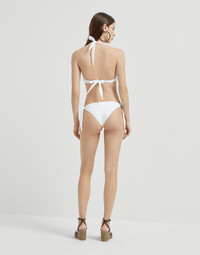 The sporty feel of techno jersey is paired with precious details in this new bikini top. Comfortable and essential, the style ties behind the neck and is enriched with the shimmering reflections of the monili embroidery, the iconic embellishment of the Brunello Cucinelli collections. The top is perfect to match with the bikini bottoms in the same fabric. MATERIALS Techno jersey is a material comprising a synthetic fiber that helps make the texture comfortable to wear and quick to dry. DETAILS Back-tie band Nickel-free monili decoration 68% NYLON, 32% ELASTANE