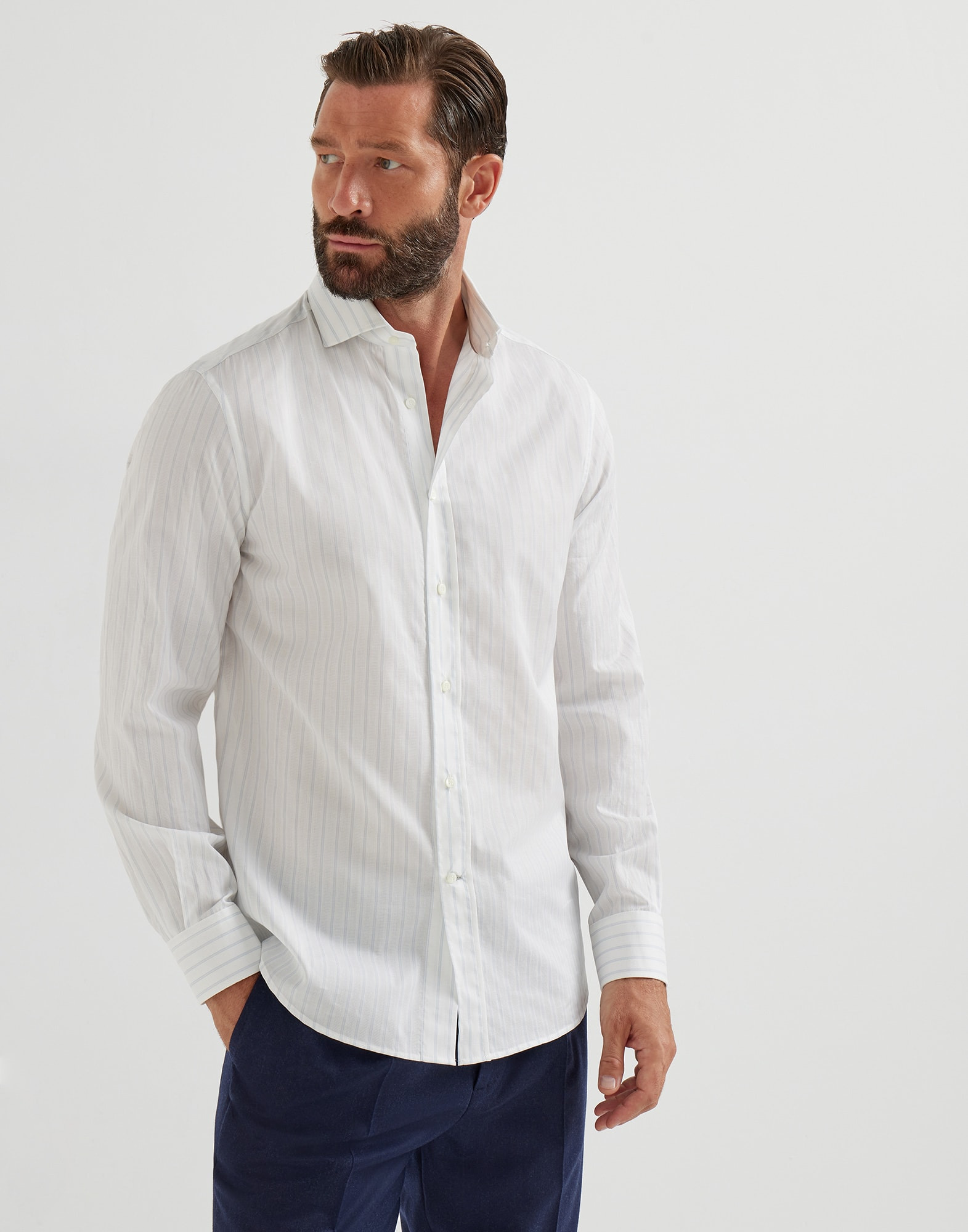 The excellence of natural fibers enhances the contemporary silhouette and impeccable construction of this easy fit shirt with spread collar. Made of pure cotton, the lightweight, versatile fabric is enriched with a textured striped pattern, creating a dynamic effect with visual depth. Defined by its regular, rather straight lines, the easy fit has a slightly shorter length than other fits, making it perfect to wear over trousers for a casual look. MATERIALS The cotton striped and textured canvas fabric offers a reinterpretation of the striped pattern with a subtly three-dimensional effect that enhances its breathability and lightness. DETAILS Placket closure with mother of pearl buttons Spread collar Cuffs have one mother of pearl button Easy fit 100% COTTON