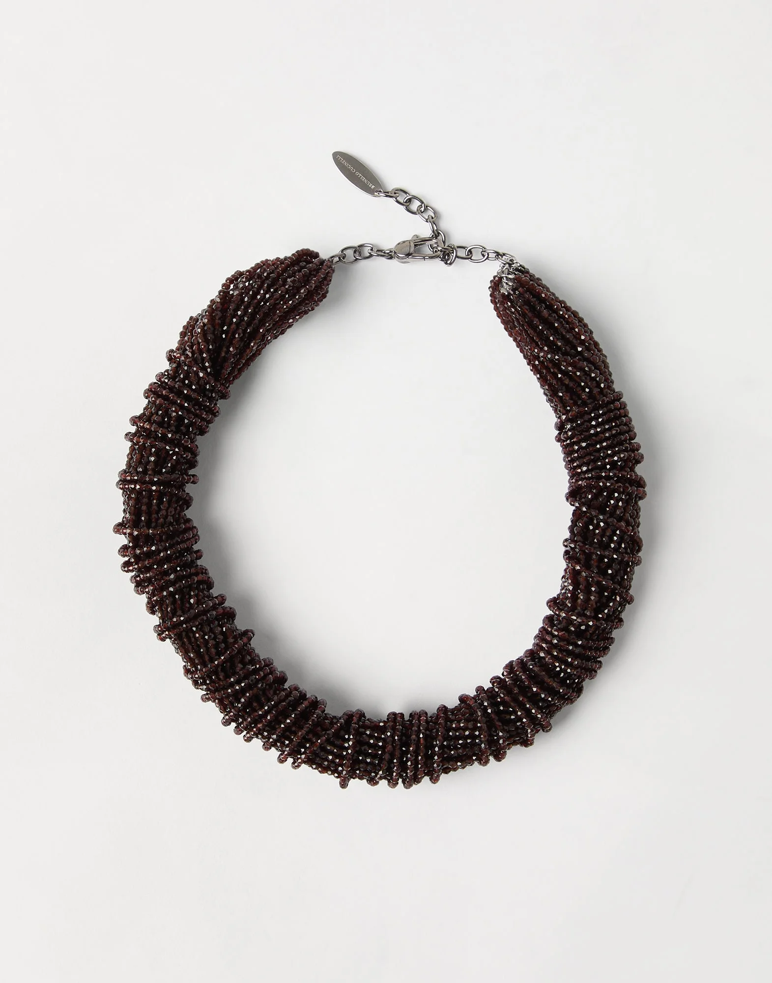 Refined workmanship and precious materials bring life to this new Vetro and Sterling Silver choker. Thin rows of faceted Vetro micro beads intertwine harmoniously to create a particular tubular construction, enhanced by a sparkling interplay of overlapping layers. The accessory is completed with a hook closure that is adjustable to different lengths. MATERIALS Together with shiny round 975 Sterling Silver beads, the faceted cut of the small Vetro beads accentuates the accessory’s metallic reflections. DETAILS Adjustable length closure clasp All metal parts are Nickel-free The maximum length of the necklace when open is approximately 40 cm (15.75")