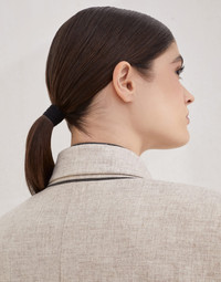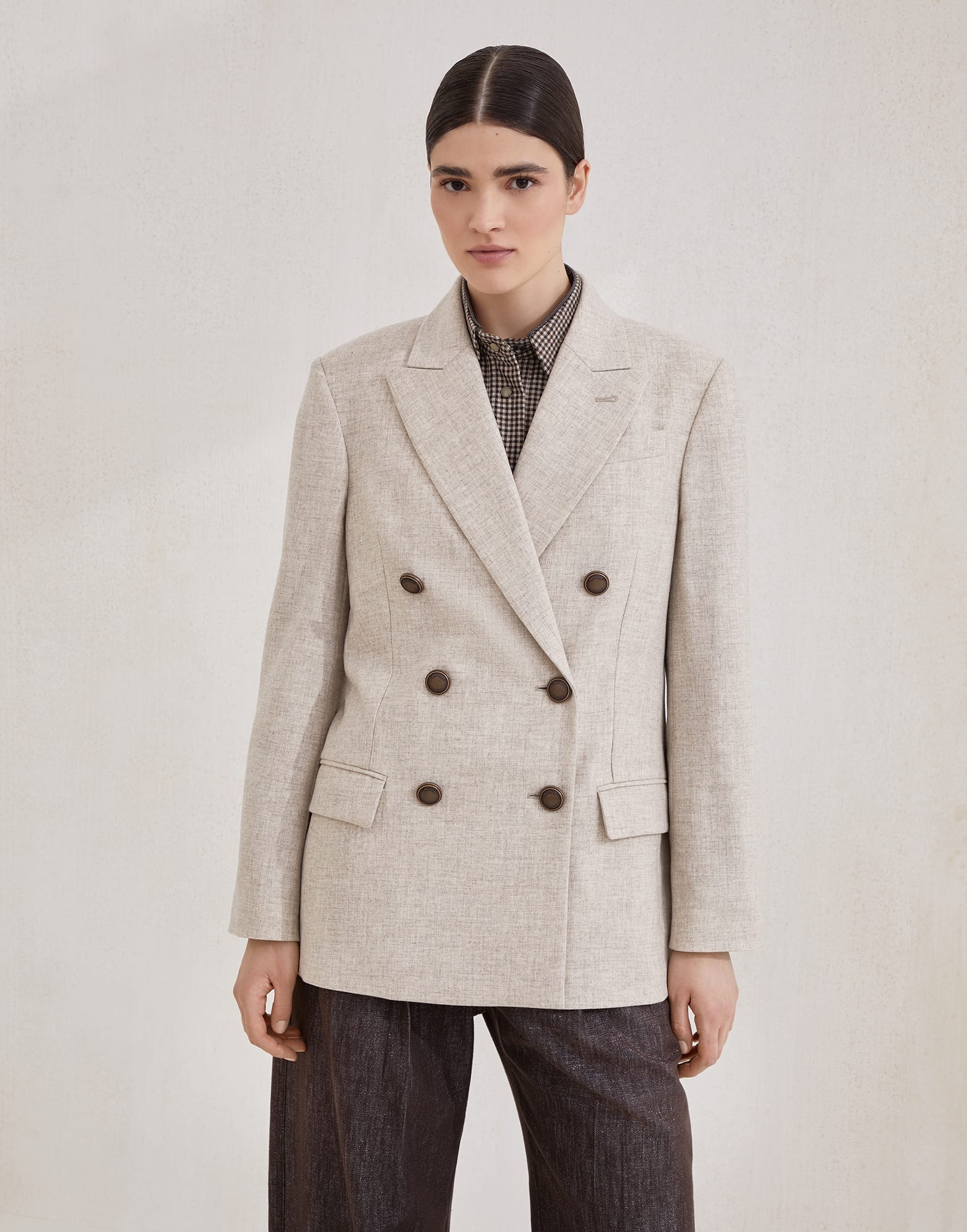 Refined materials and precious details come together in this new virgin wool and cashmere twill flannel blazer. The pronounced peak lapels, double-breasted closure and classic flap pockets emphasize the garment’s sartorial look, interpreted in a sophisticated, feminine way. Soft and comfortable, the luxurious fabric adds a nice sense of warmth, while a delicate shiny monili embroidery, the iconic embellishment of the Brunello Cucinelli collections, completes the blazer with a sophisticated sparkling note. MATERIALS The virgin wool and cashmere twill flannel stands out for its unmistakable diagonal weave, giving the fabric structure and resistance. The extraordinarily soft, cozy hand, provides a warm, comfortable sensation when worn. DETAILS Metal button closure Silk-blend crepe lining Peak lapel Chest pocket Hand pockets with flap Cuffs have four metal buttons Single back vent Nickel-free monili decoration 95% VIRGIN WOOL, 5% CASHMERE